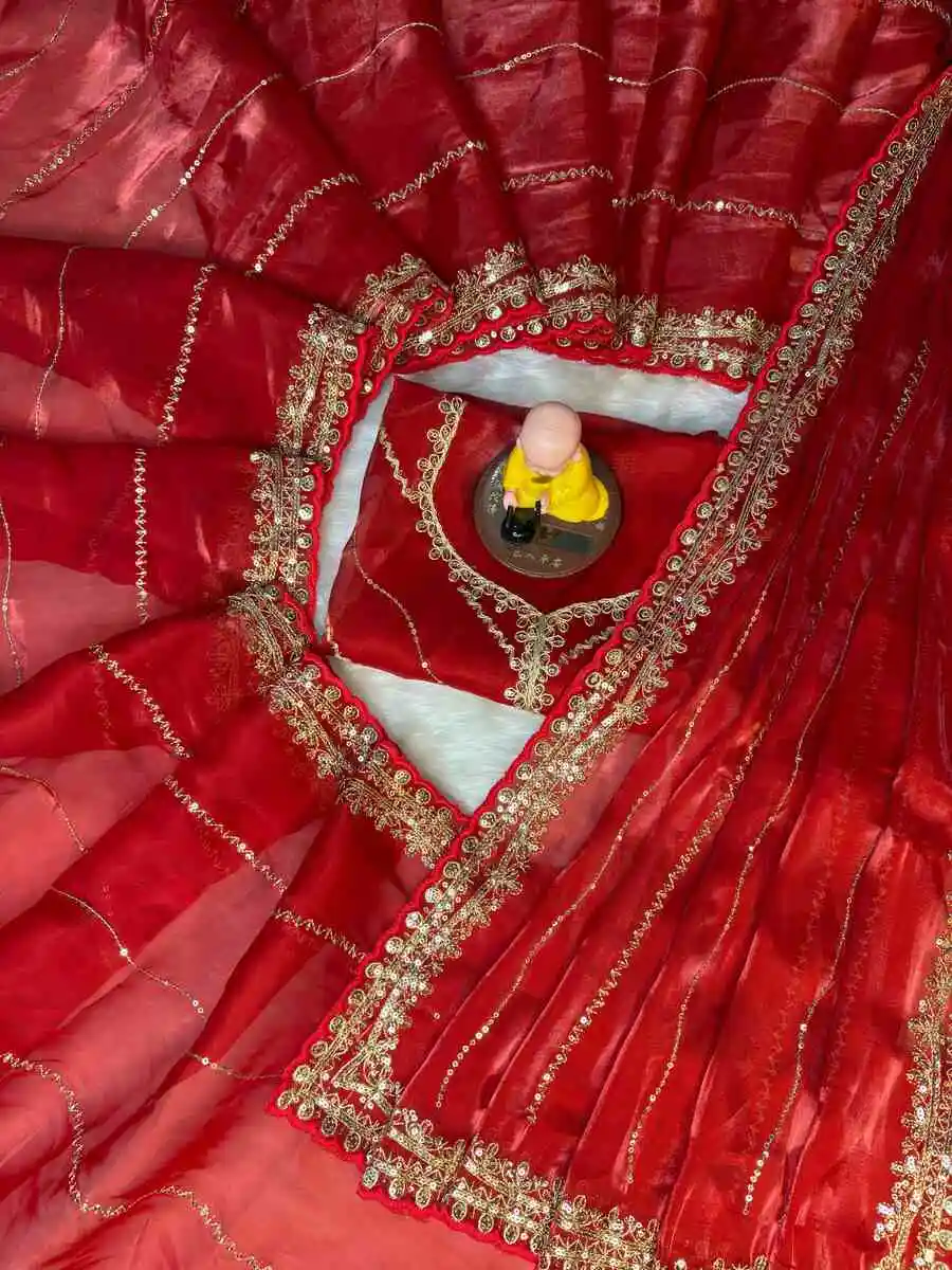 DESIGNER JIMMY CHOO SEQUENCE ZARI WORK AARCO BORDER WORK SAREE WITH UNSTITCHED BLOUSE RED