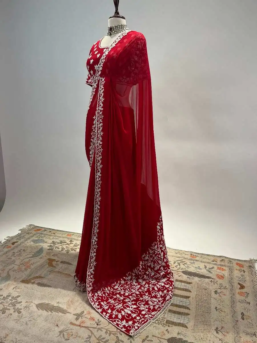 DESIGNER JIMMY CHOO SILK MULTI THREAD EMBROIDERY CODING SEQUENCE WORK SAREE WITH UNSTITCHED BLOUSE RED