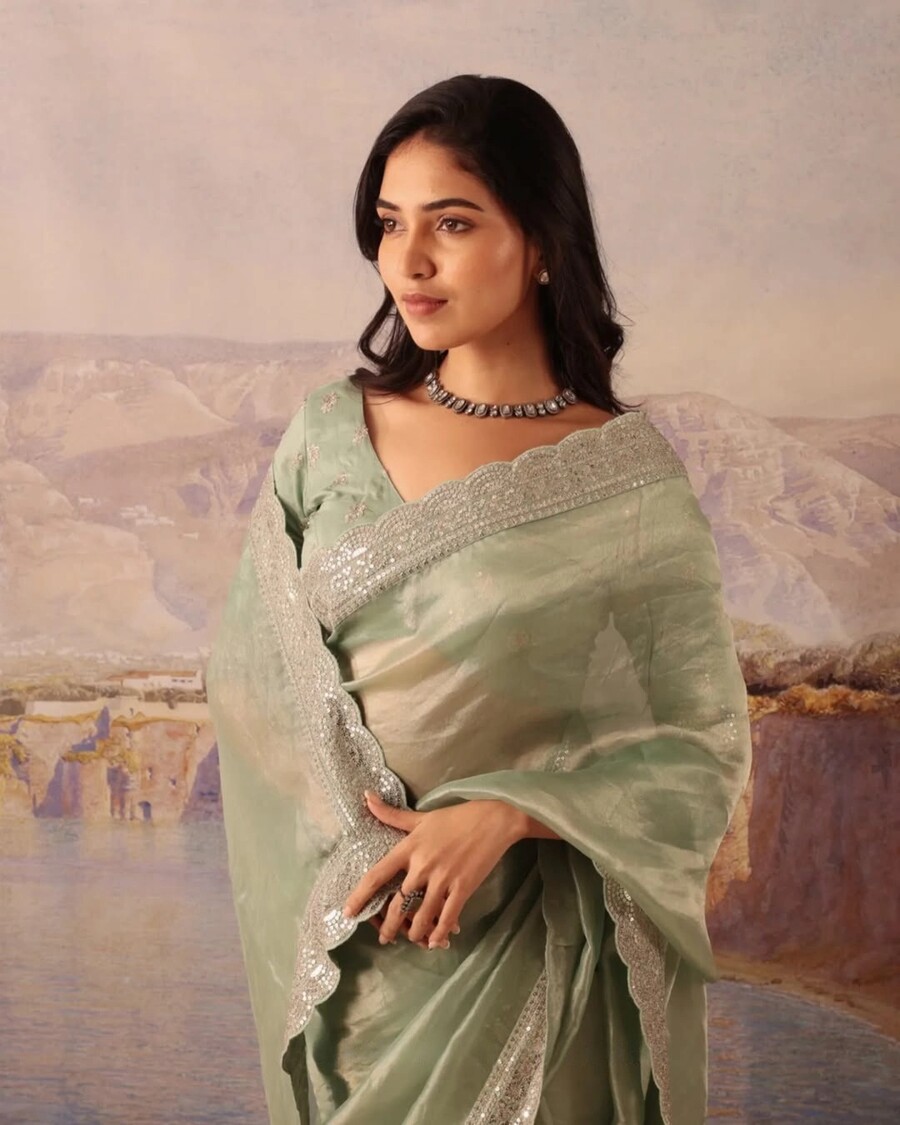 DESIGNER JIMMY CHOO SILK SEQUENCE EMBROIDERY CUT WORK LACE BORDER WORK SAREE WITH UNSTITCHED BLOUSE PISTA