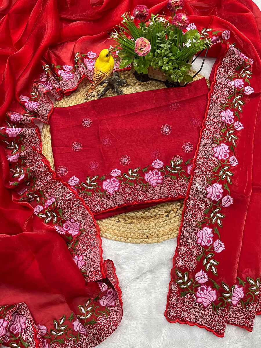 DESIGNER JIMMY CHOO THREAD EMBROIDERY WORK WITH CUTWORK BORDER WORK SAREE WITH UNSTITCHED BLOUSE RED