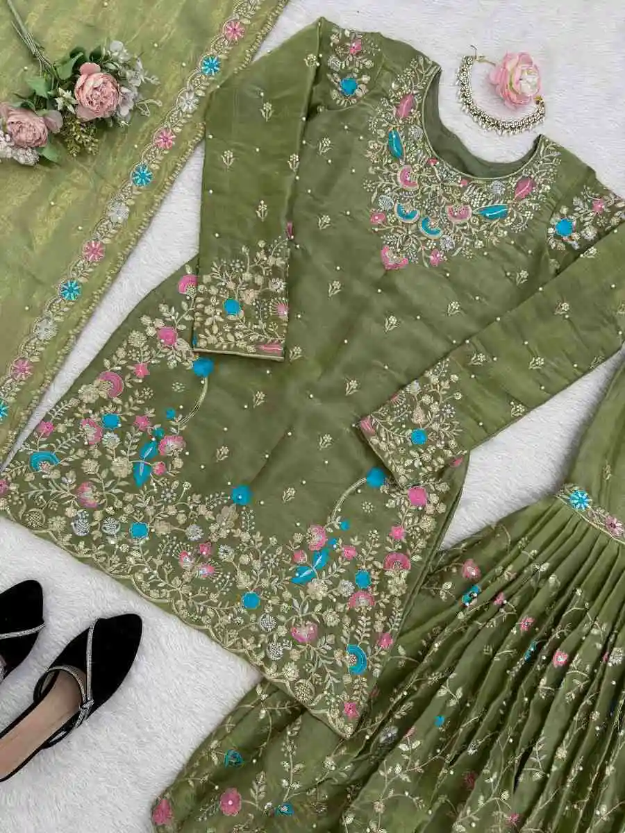 SHARARA FABRIC : PURE HEAVY CHINON SILK WITH EMBROIDERY SEQUENCE WORK WITH REAL MIRROR HAND WORK