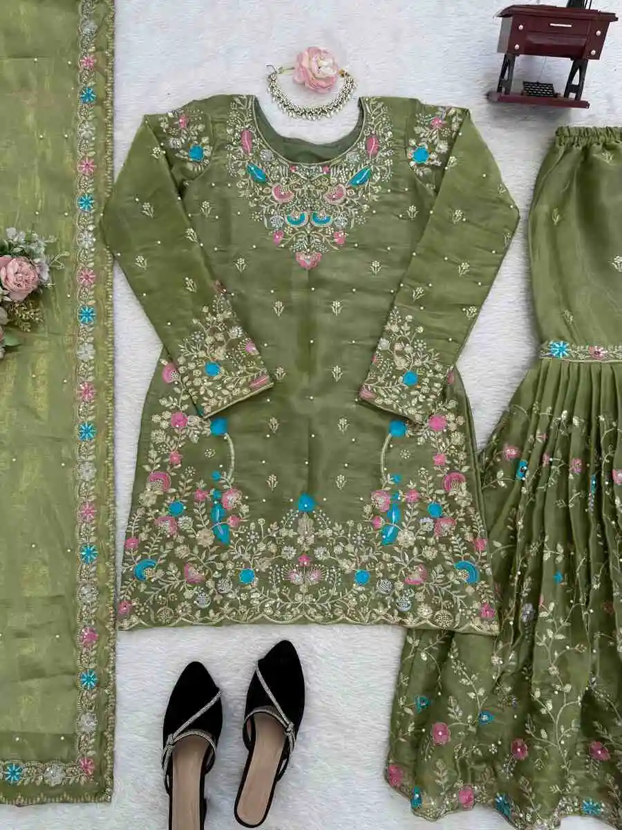 DESIGNER JMC SILK THREAD WITH SEQUENCE WITH RIVET MOTI WORK TOP SHARARA WITH DUPATTA PISTA