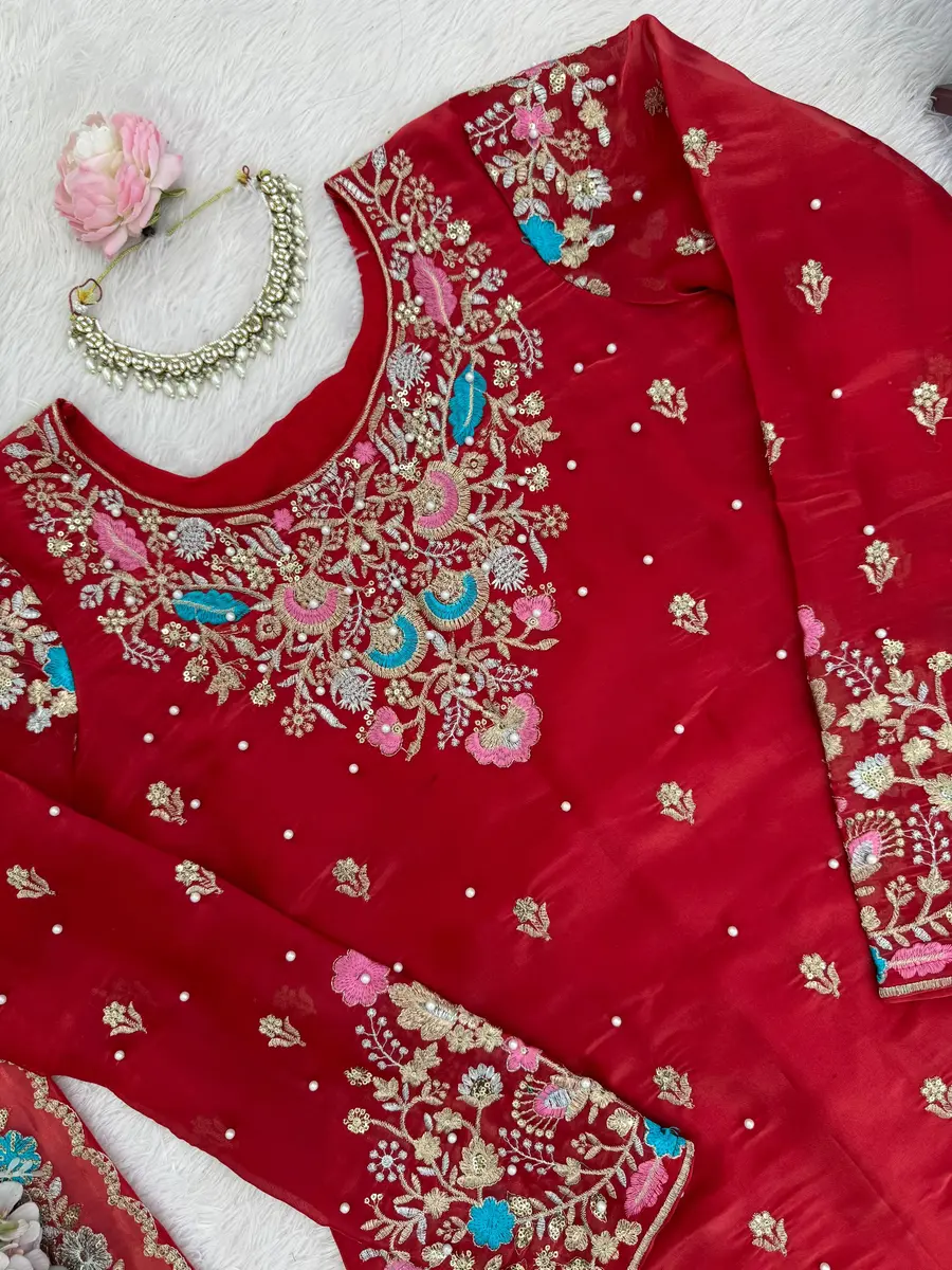 DESIGNER JMC SILK THREAD WITH SEQUENCE WITH RIVET MOTI WORK TOP SHARARA WITH DUPATTA RED