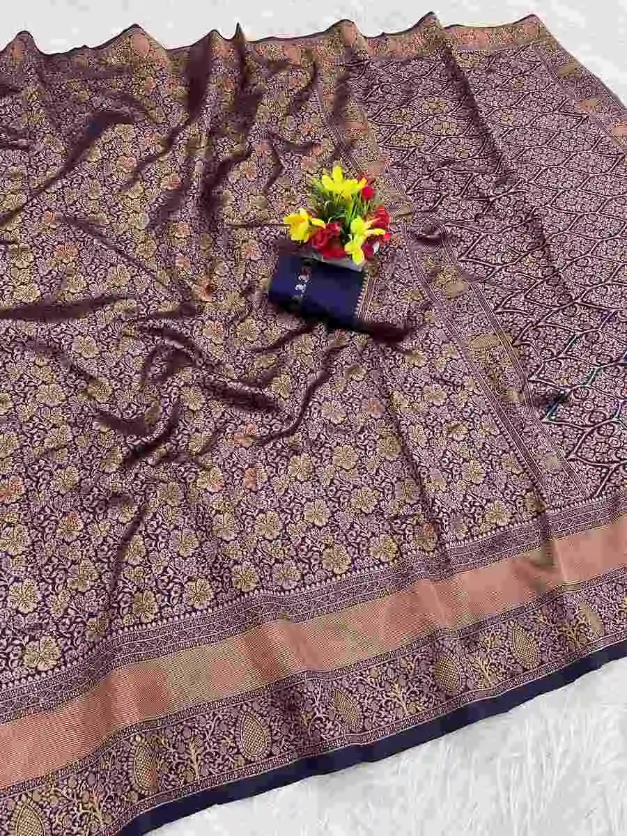 DESIGNER LICHI SILK BANARASI WEAVING WORK SAREE WITH UNSTITCHED BLOUSE NAVY BLUE