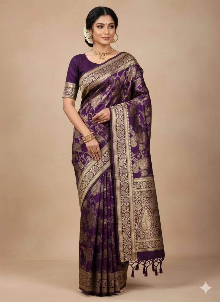 DESIGNER LICHI SILK BANARASI WEAVING WORK SAREE WITH UNSTITCHED BLOUSE PURPLE