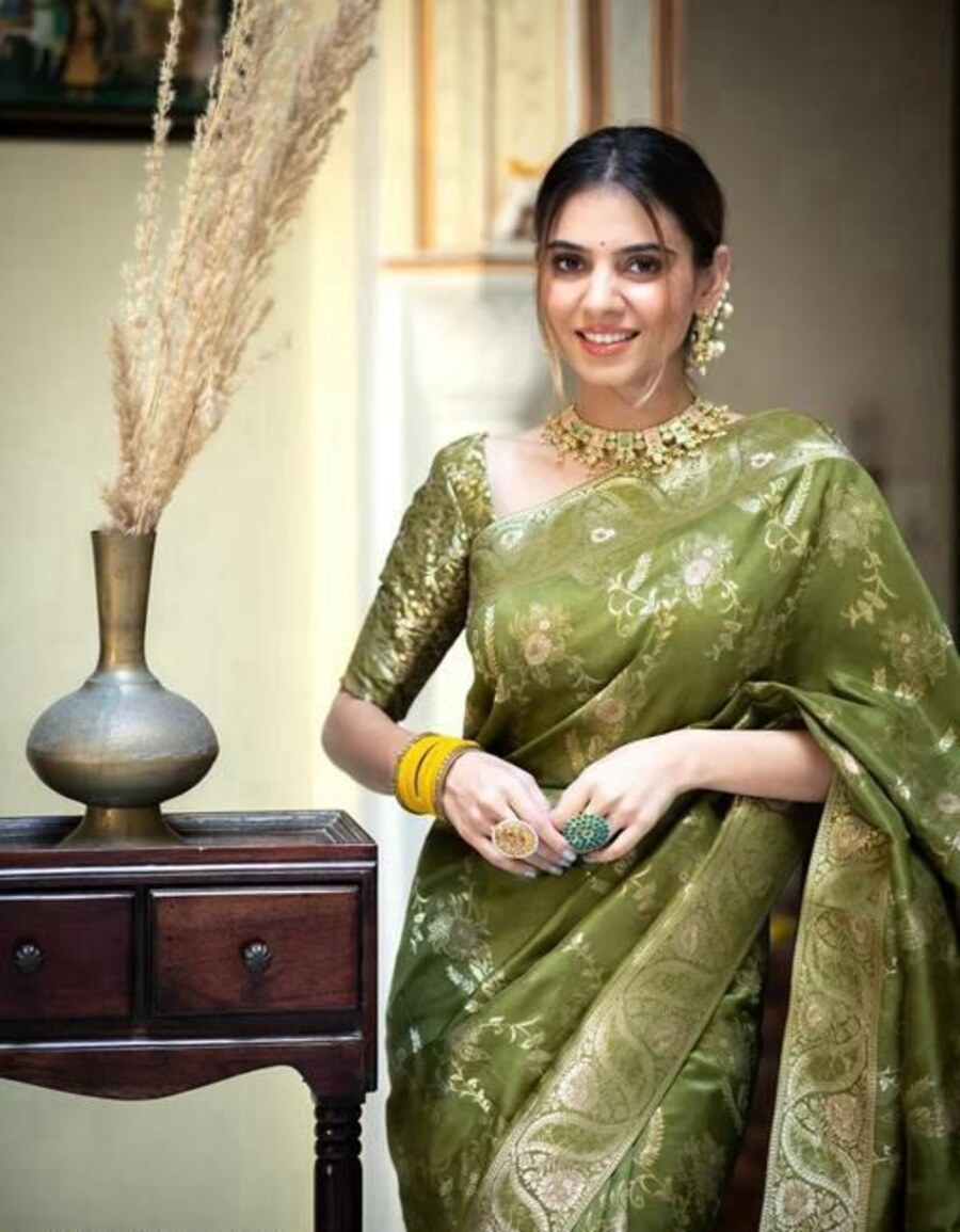 DESIGNER LICHI SILK JACQUARD WORK SAREE WITH UNSTITCHED BLOUSE MEHNDI