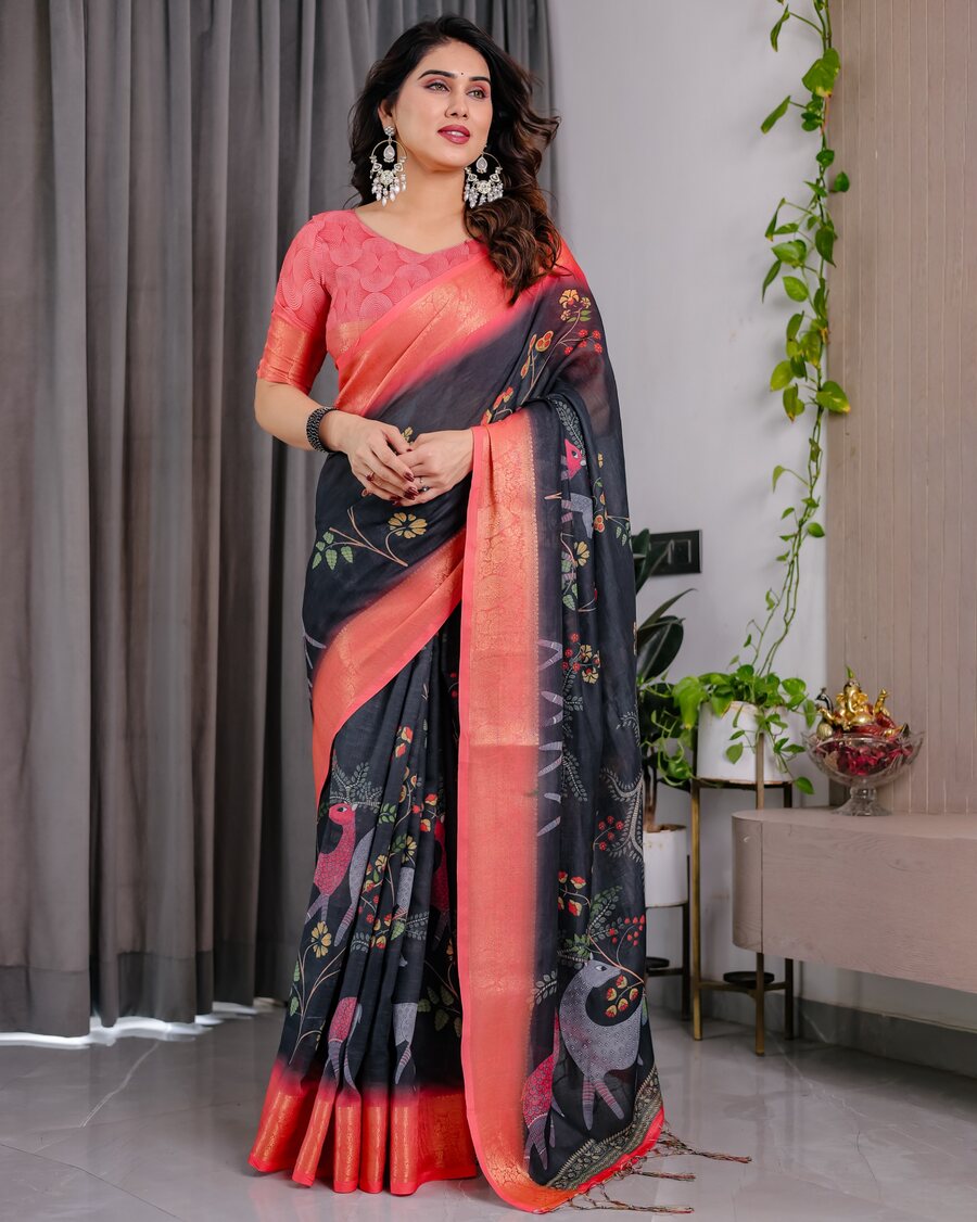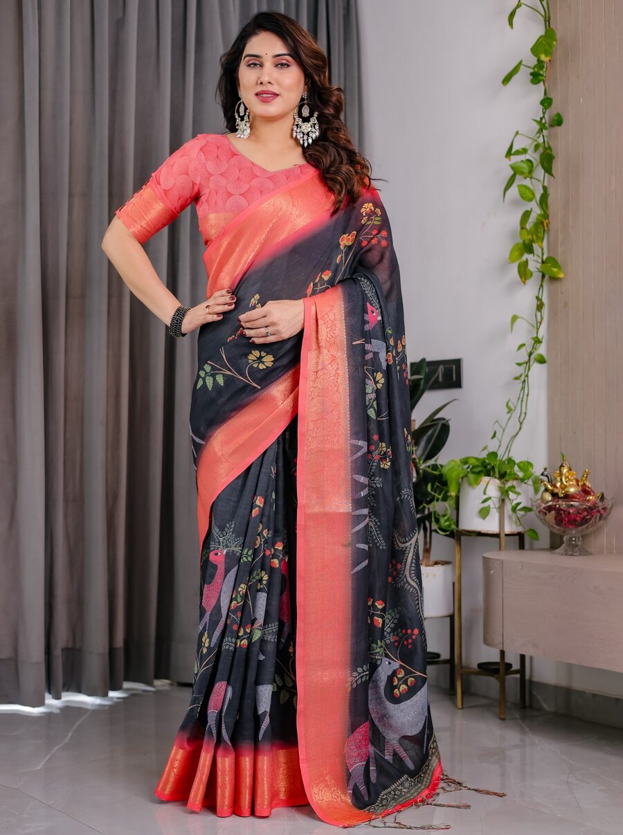 DESIGNER LINEN DIGITAL FLORAL PRINT RICH ZARI WOVEN BORDERS WORK SAREE WITH UNSTITCHED BLOUSE BLACK