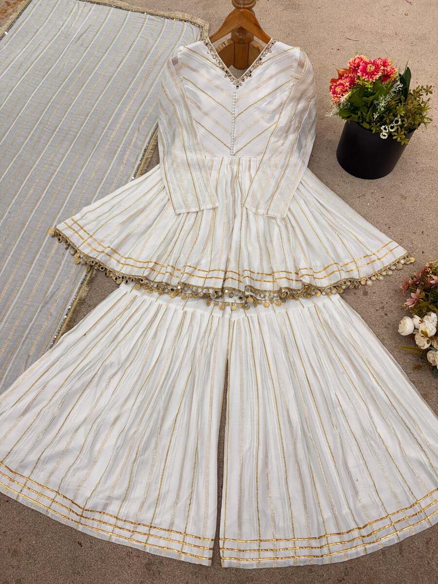DESIGNER MAL CHANDERI REAL MIRROR WITH HANDWORK TOP SHARARA WITH DUPATTA WHITE