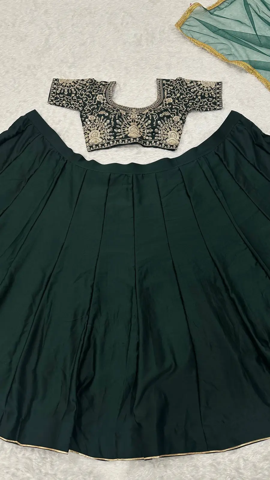 DESIGNER MALAI SATIN PLAIN LEHENGA WITH SEQUENCE , DORI & ZARI WORK BLOUSE AND DUPATTA GREEN