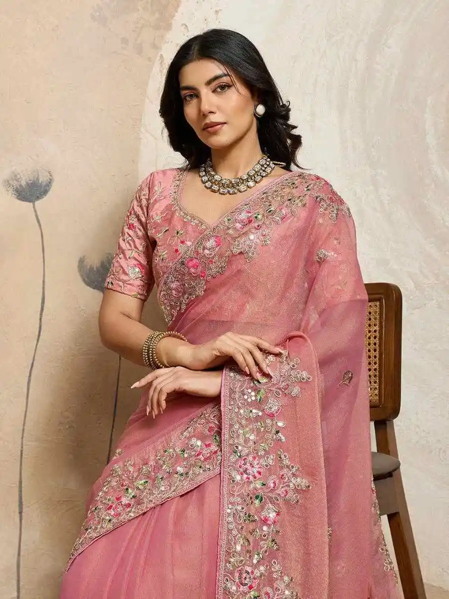 SAREE FABRIC : PURE SOFT TABBY ORGANZA WITH HEAVY EMBROIDERY MULTI TREADS , CODING & SEQUENCE WORK & FANCY CUT WORK BORDER