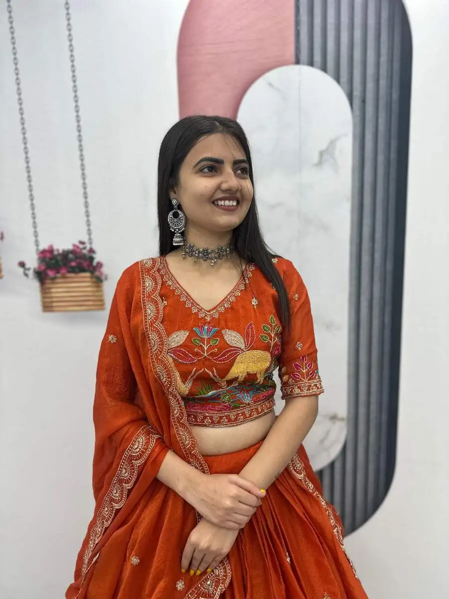 DESIGNER MOSS SHIMMER EMBROIDERY THREAD & PIPE VAL WORK LEHENGA CHOLI WITH DUPATTA ORANGE