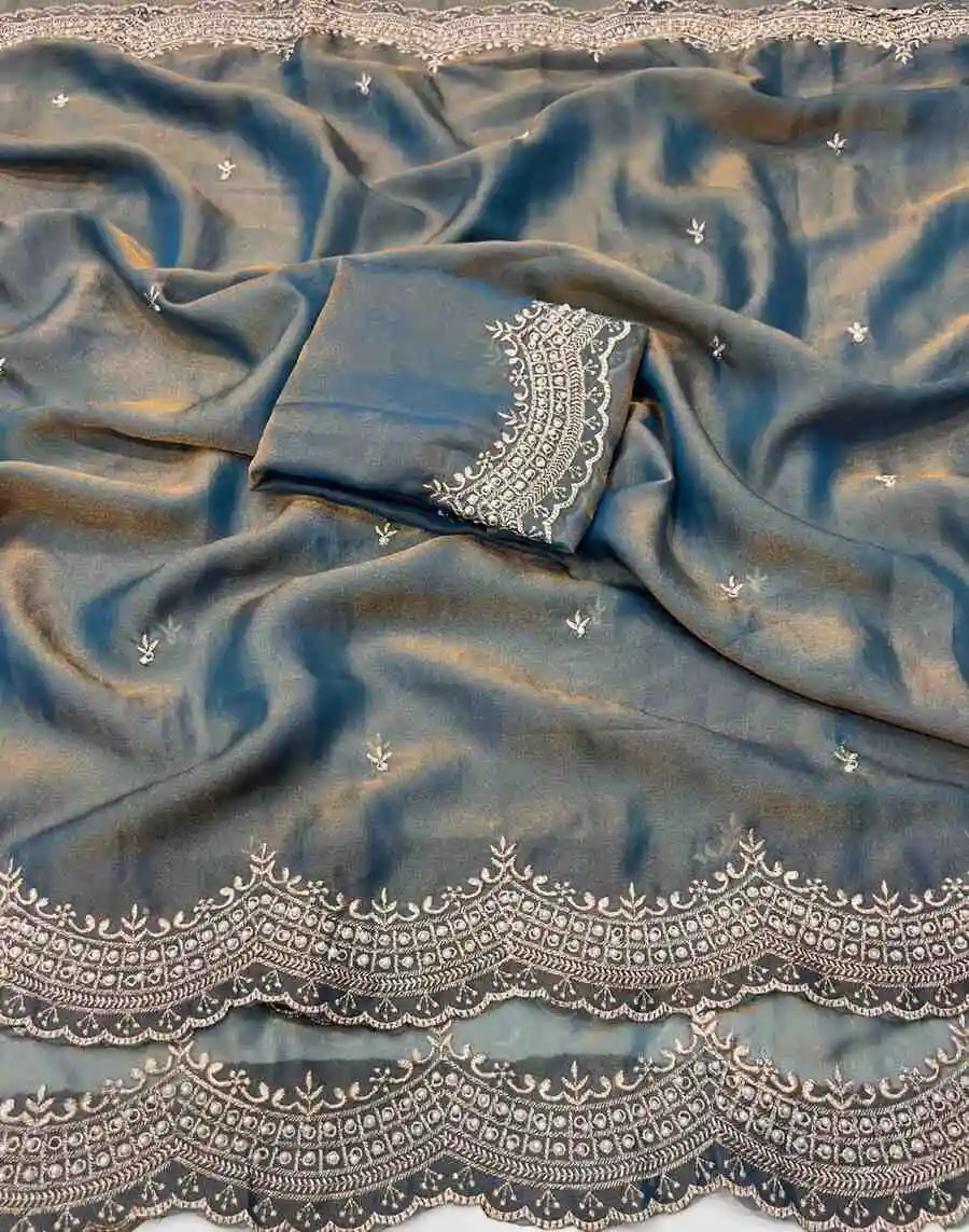 DESIGNER MOSS SILK MULTI EMBROIDERY WITH CUT BORDER AND DIAMOND WORK SAREE WITH UNSTITCHED BLOUSE SKY