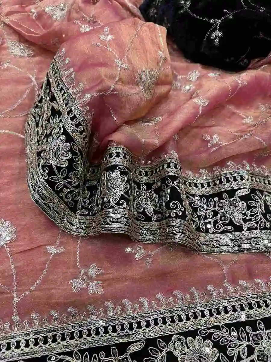 WORK : BEAUTIFUL SEQUENCE AND ZARI WORK EMBROIDERY WITH VELVET LACE BORDER