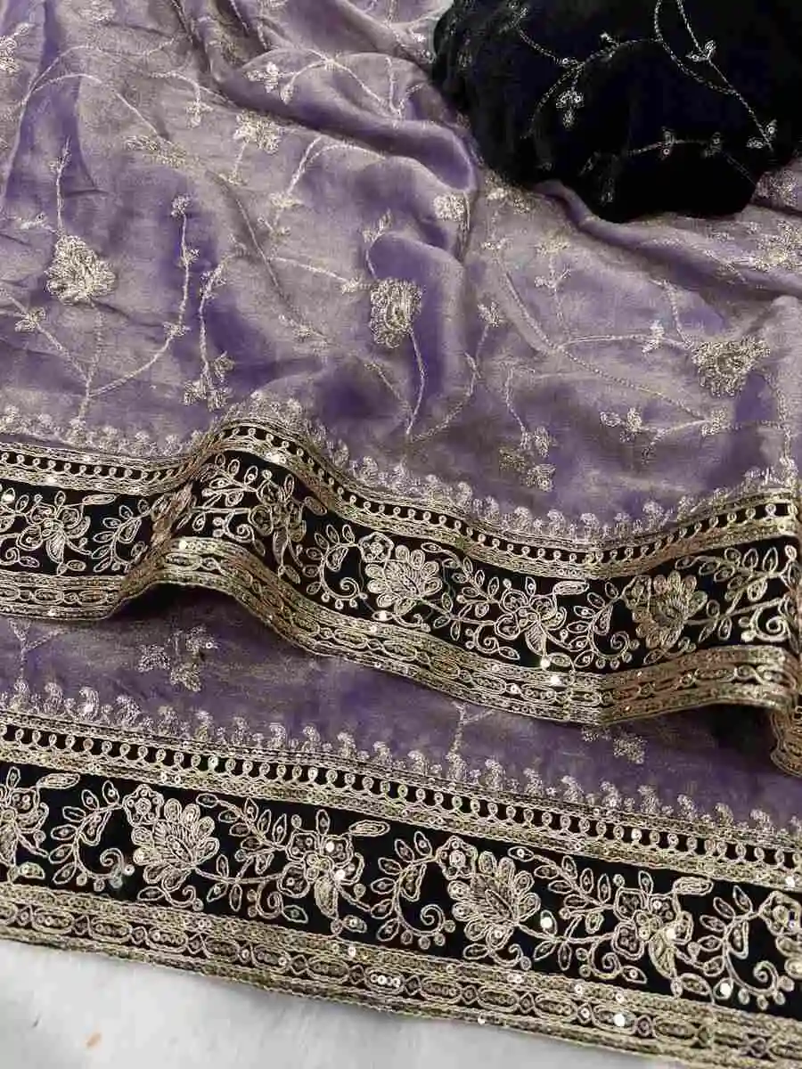 DESIGNER MOSS SILK SEQUENCE AND ZARI EMBROIDERY WITH VELVET LACE BORDER WORK SAREE WITH UNSTITCHED BLOUSE PURPLE