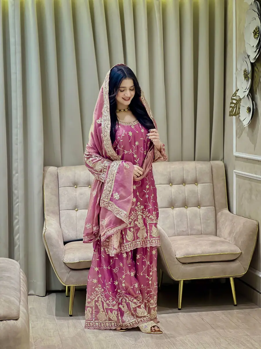 DESIGNER MOSS SILK SEQUENCE & ZARI EMBROIDERY WORK TOP PALAZZO WITH DUPATTA PINK
