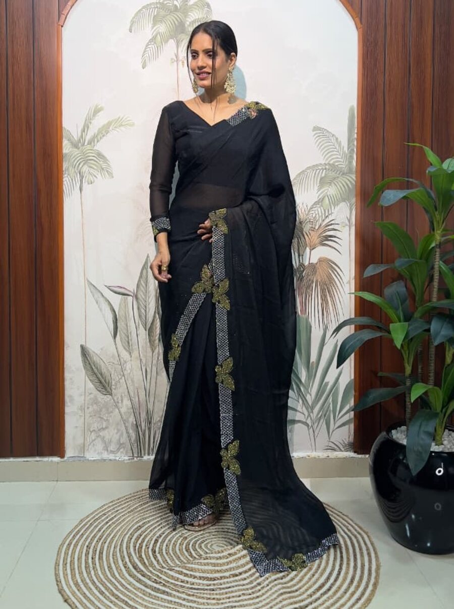 DESIGNER MOSS SILK SWAROWSKI &CUT WORK READY TO WEAR SAREE WITH STITCHED BLOUSE BLACK