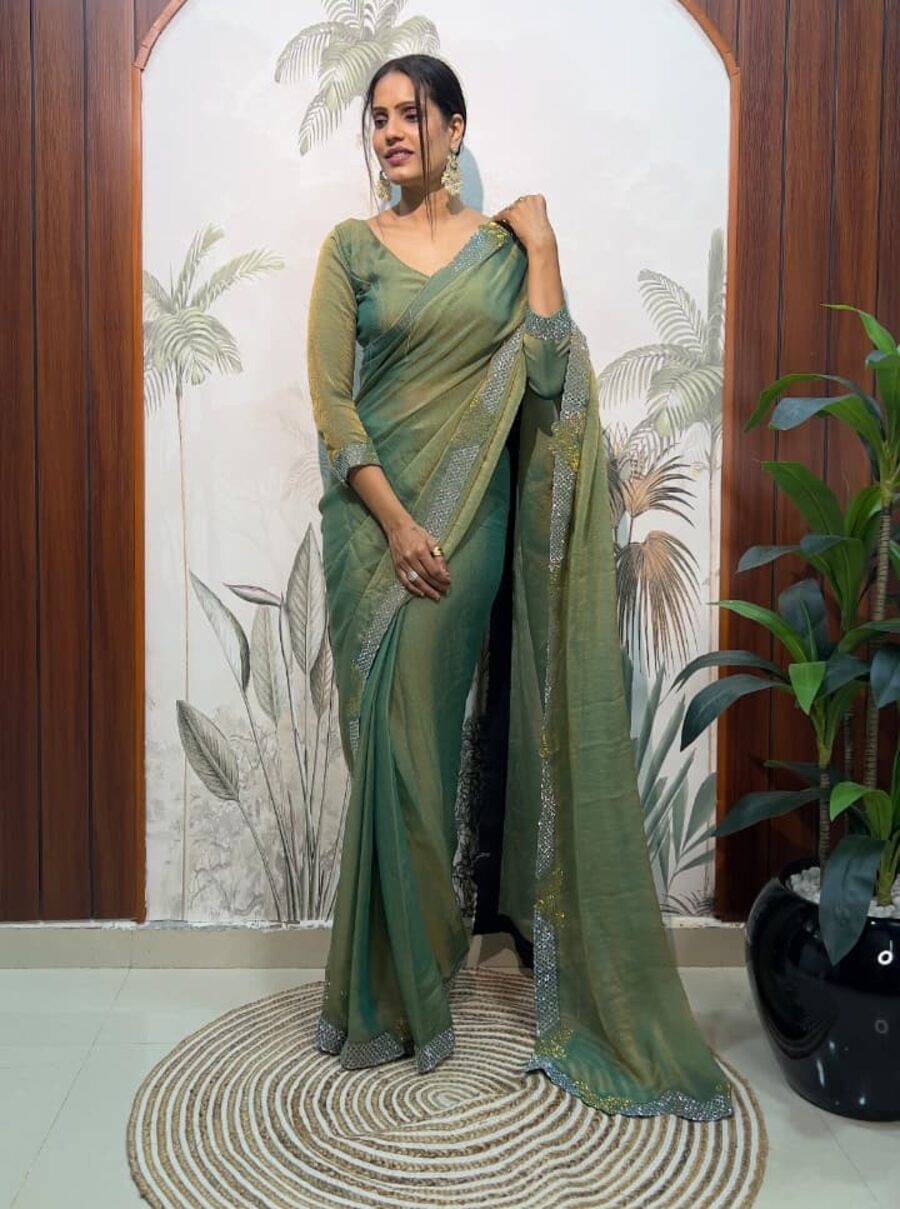 DESIGNER MOSS SILK SWAROWSKI &CUT WORK READY TO WEAR SAREE WITH STITCHED BLOUSE MINT