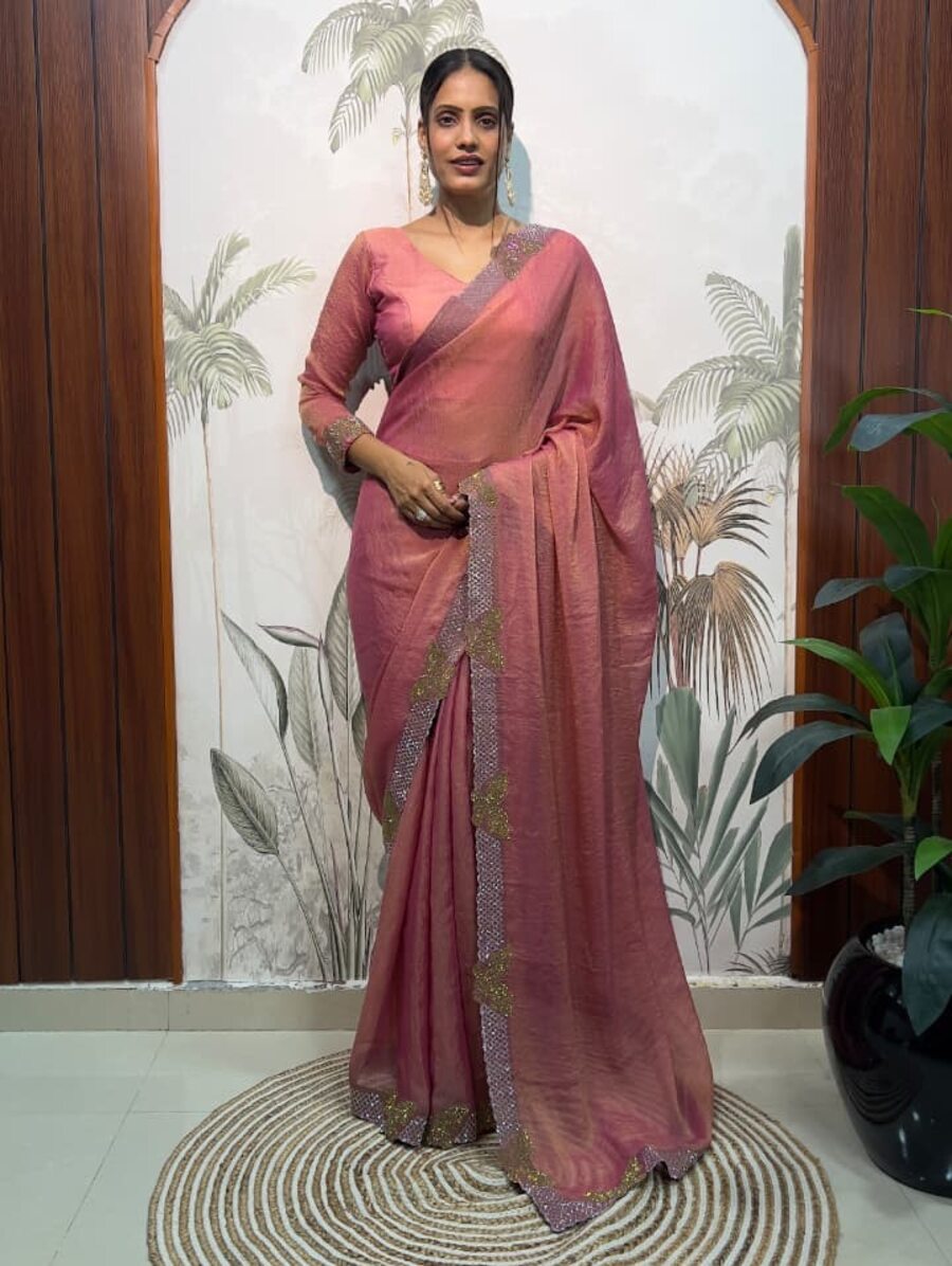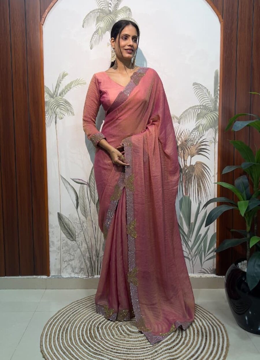 DESIGNER MOSS SILK SWAROWSKI &CUT WORK READY TO WEAR SAREE WITH STITCHED BLOUSE PEACH