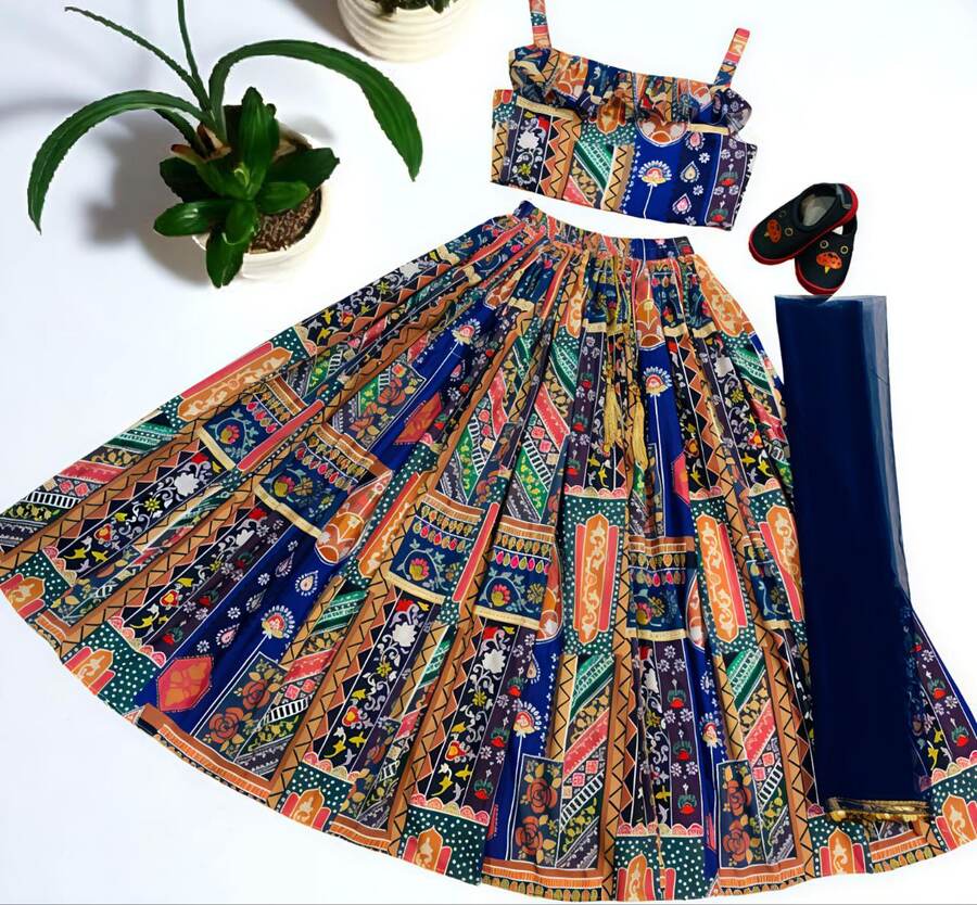 DESIGNER MUL MUL SILK DESIGNER PRINT WORK KID’S LEHENGA CHOLI WITH DUPATTA BLUE