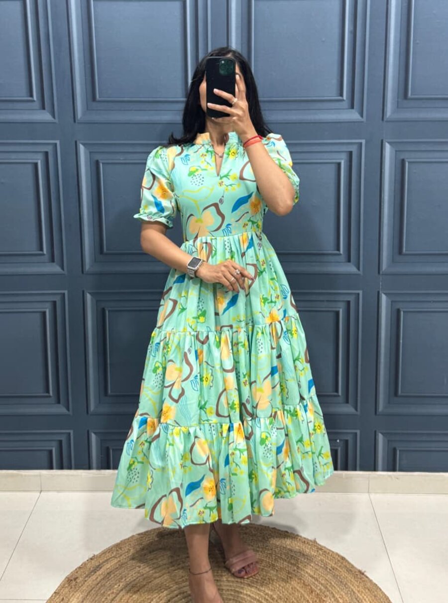 DESIGNER MUSLIN COTTON PRINT WORK AND STYLISH 3 LAYER PATTERN WORK ONE PIECE GREEN