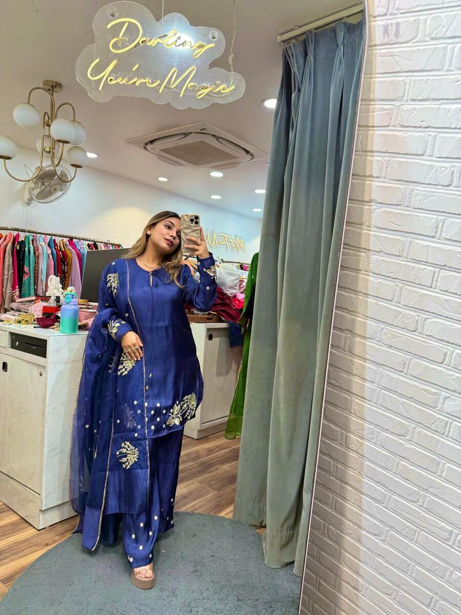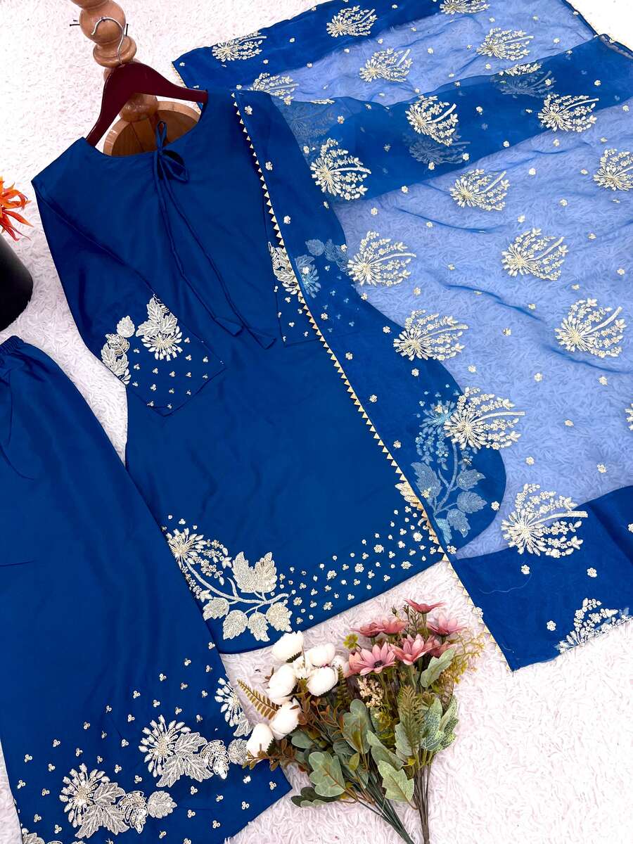 DESIGNER NATURAL CREEP EMBROIDERY SEQUENCE WORK TOP PALAZZO WITH DUPATTA BLUE