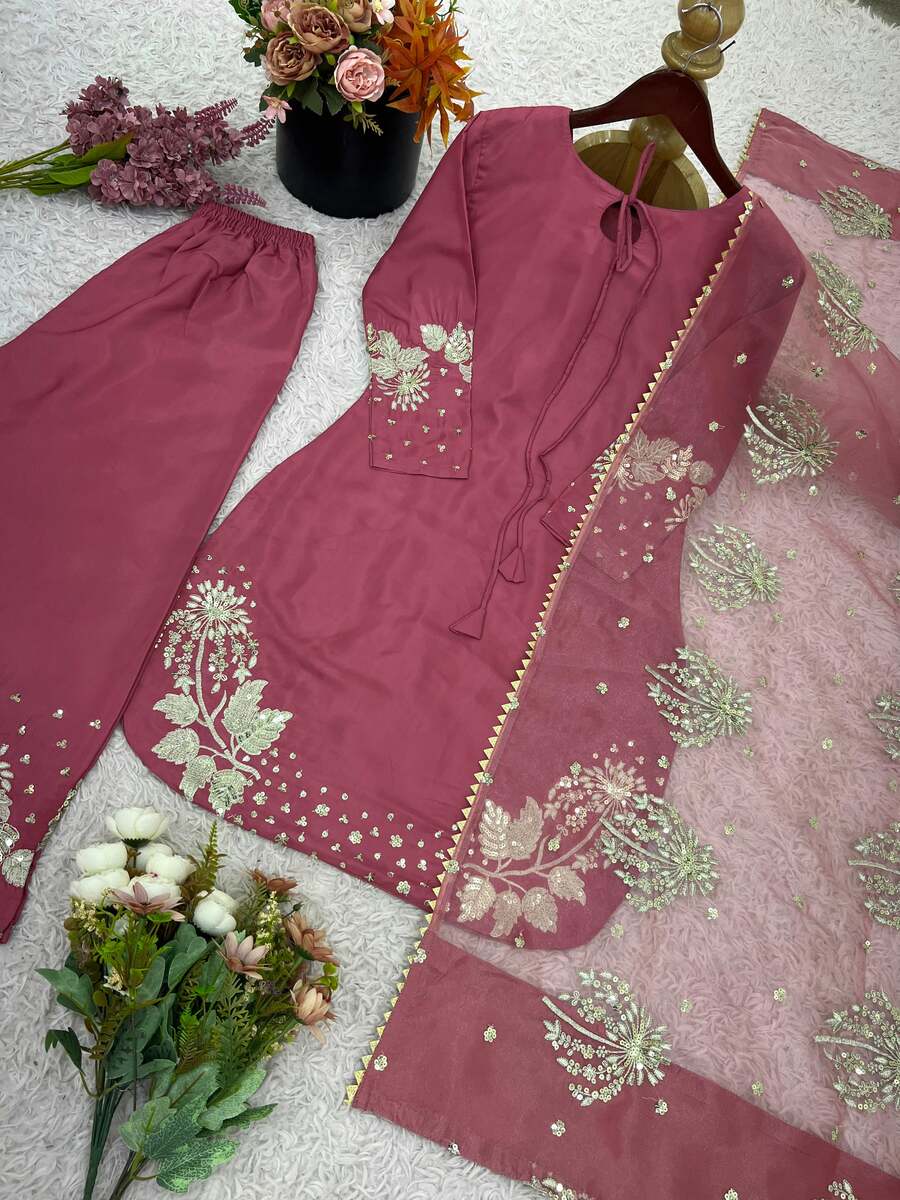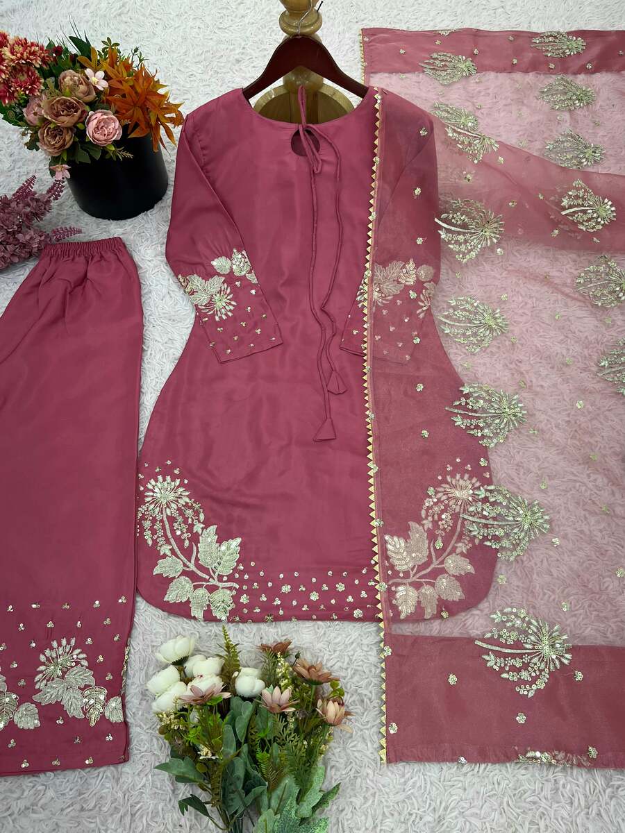 DESIGNER NATURAL CREEP EMBROIDERY SEQUENCE WORK TOP PALAZZO WITH DUPATTA PINK