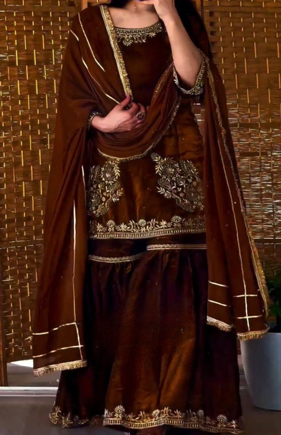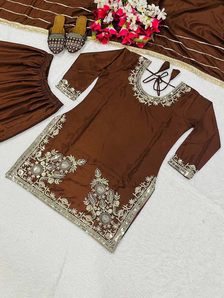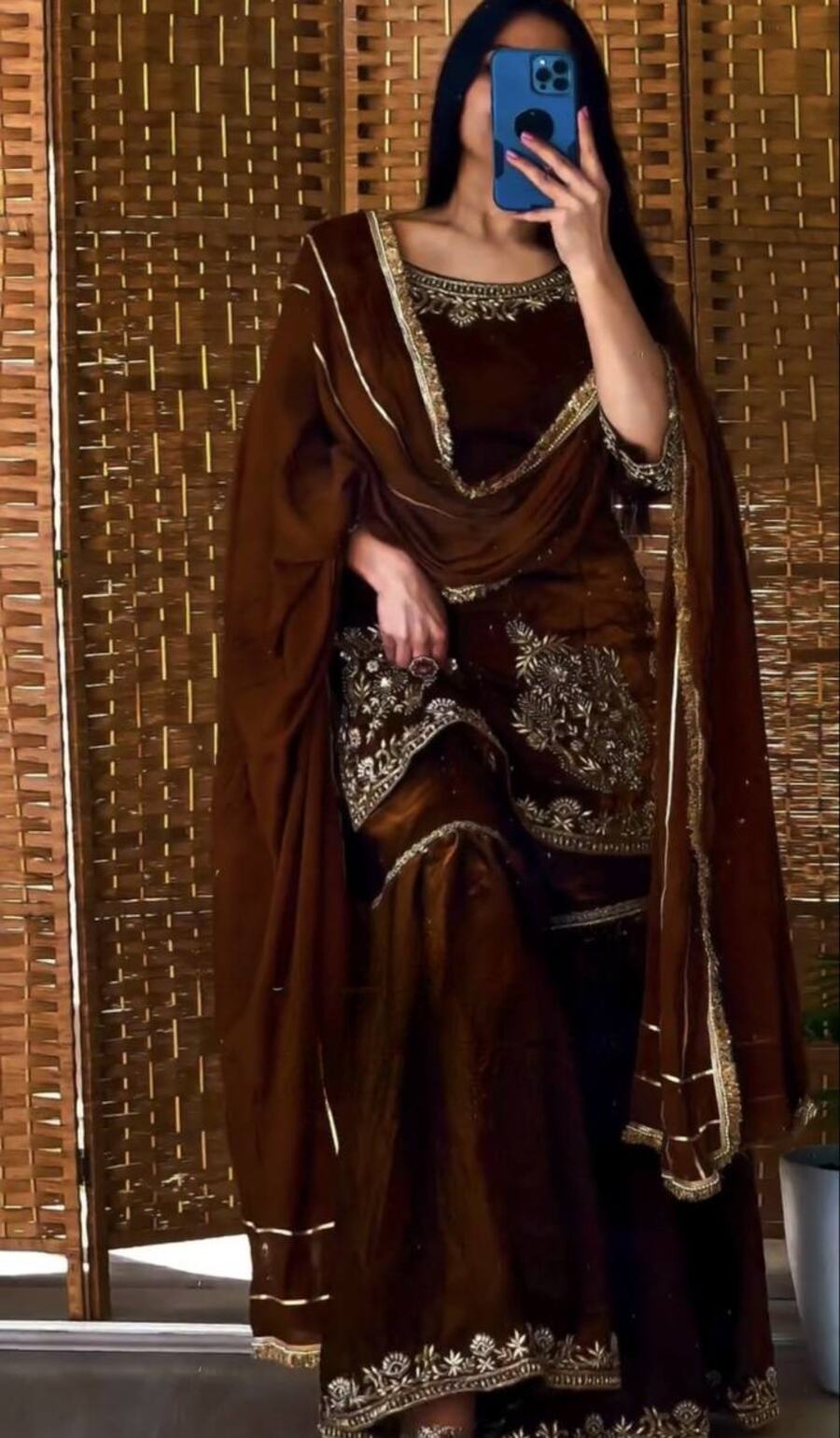 DESIGNER NATURAL CREPE SEQUENCE EMBROIDERY WORK TOP SHARARA WITH DUPATTA CHIKU