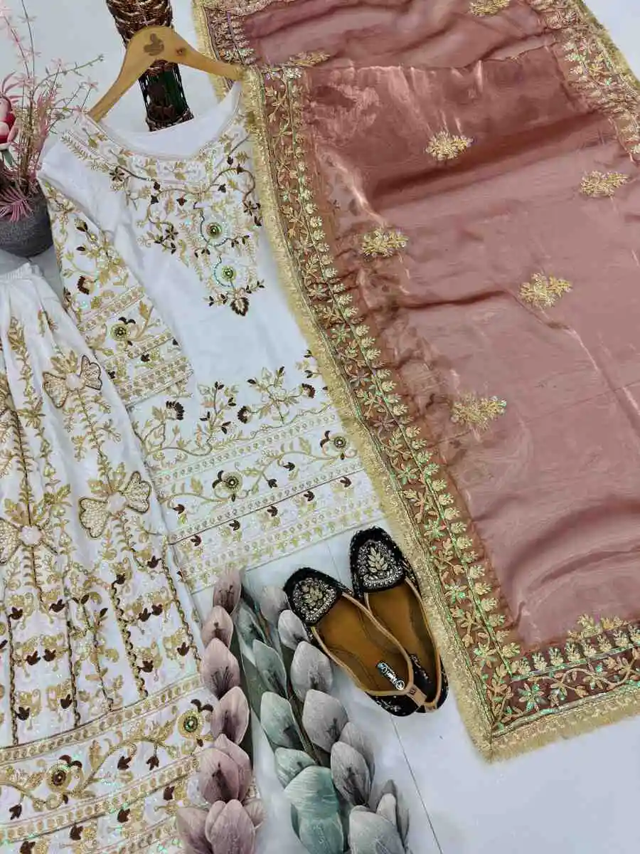 DESIGNER NATURAL SILK EMBROIDERY CHAIN SEQUENCE WORK TOP PALAZZO WITH DUPATTA CHIKU AND WHITE