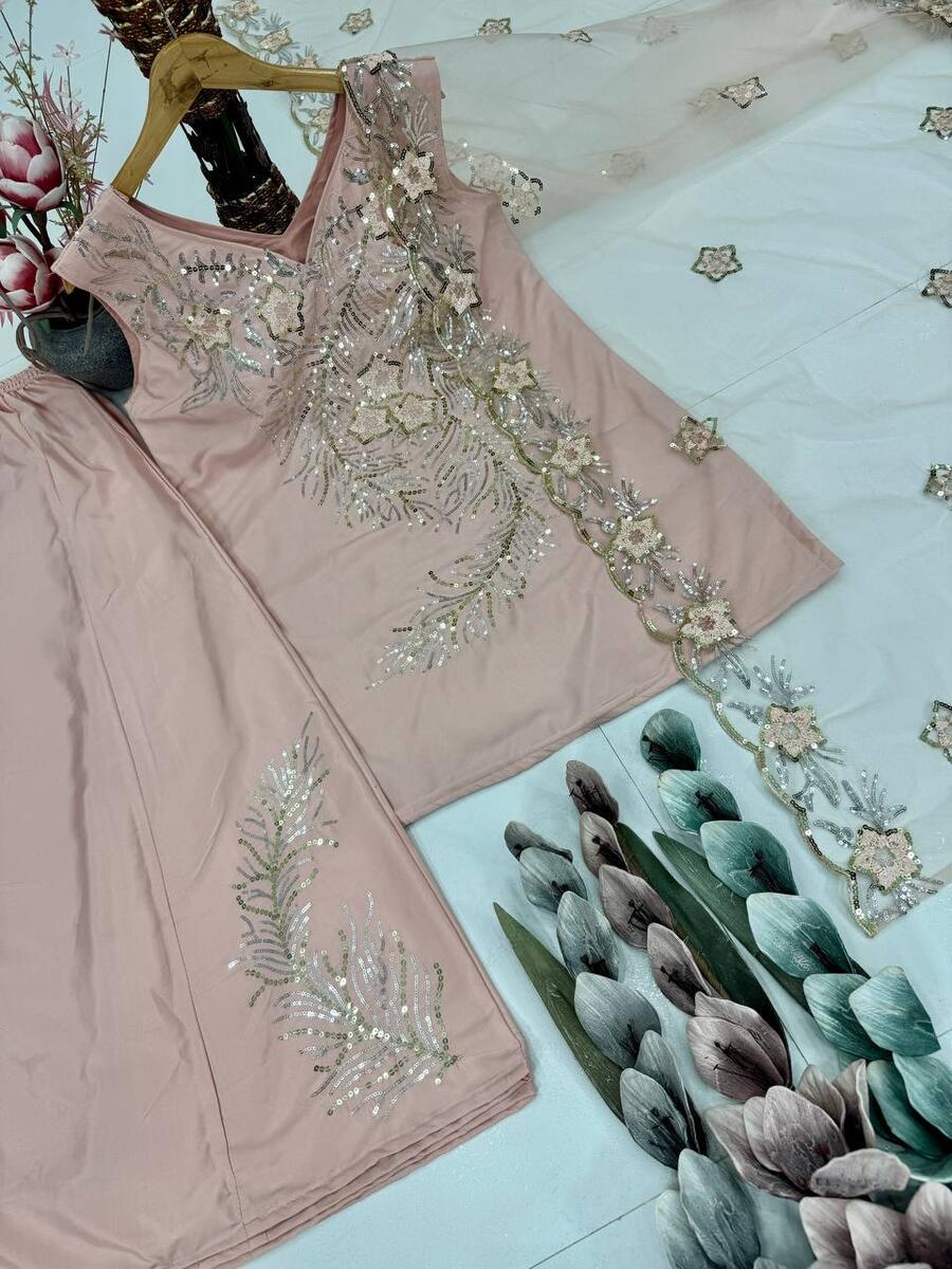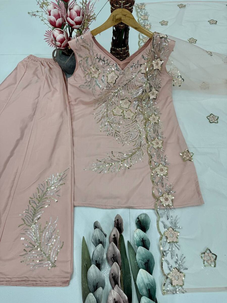 DESIGNER NATURAL SILK EMBROIDERY SEQUENCE WORK TOP PALAZZO WITH DUPATTA PEACH