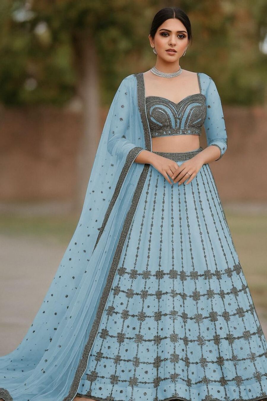 DESIGNER NET CHAIN WORK LEHENGA CHOLI WITH DUPATTA SKY