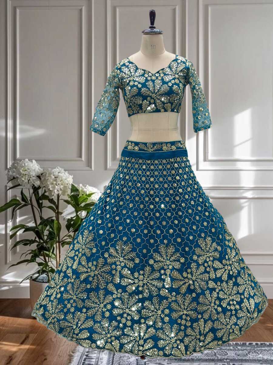 DESIGNER NET EMBROIDERY SEQUENCE DESIGN WORK LEHENGA CHOLI WITH DUPATTA RAMA