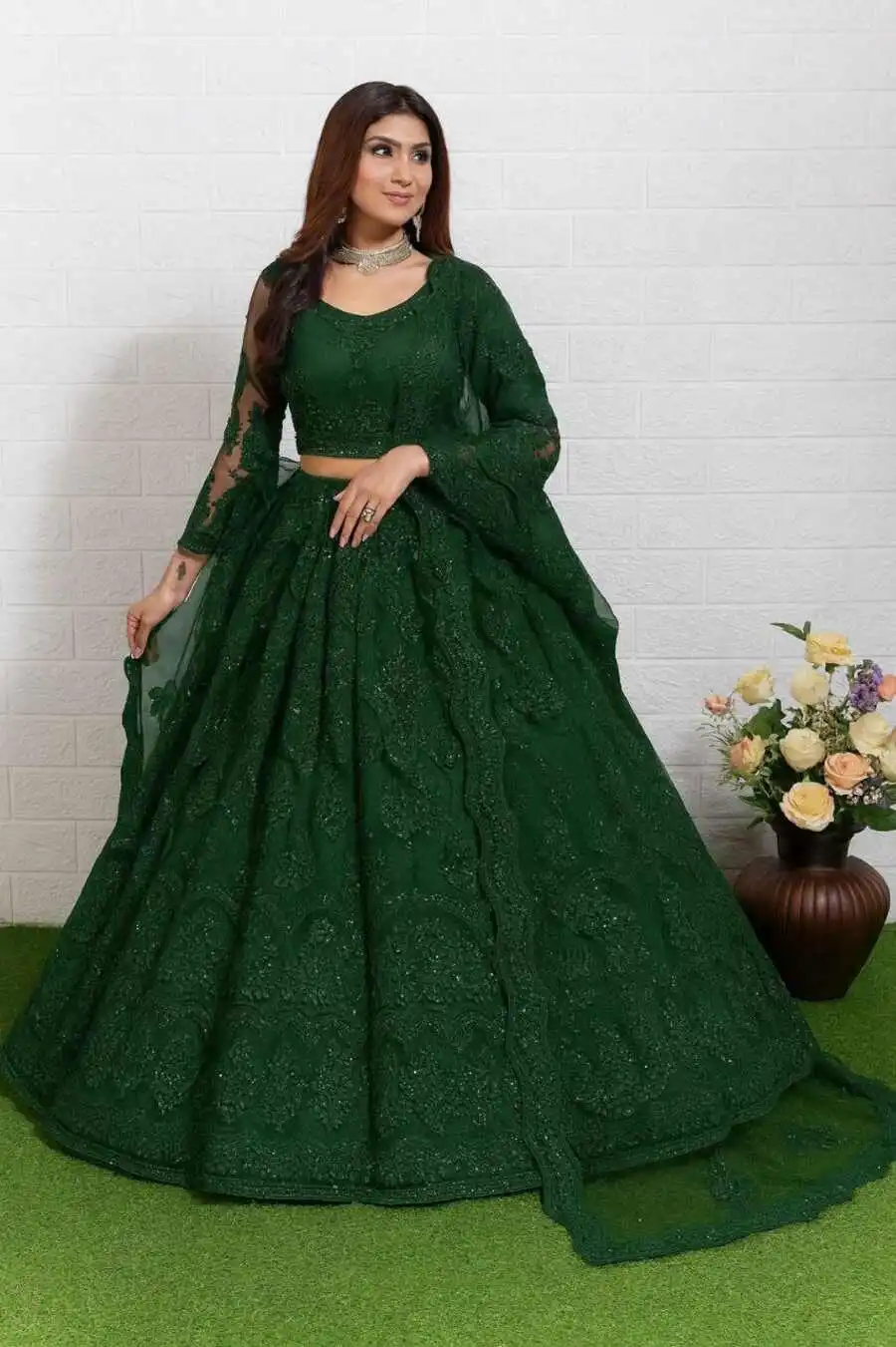 DESIGNER NET EMBROIDERY WORK LEHENGA CHOLI WITH DUPATTA GREEN