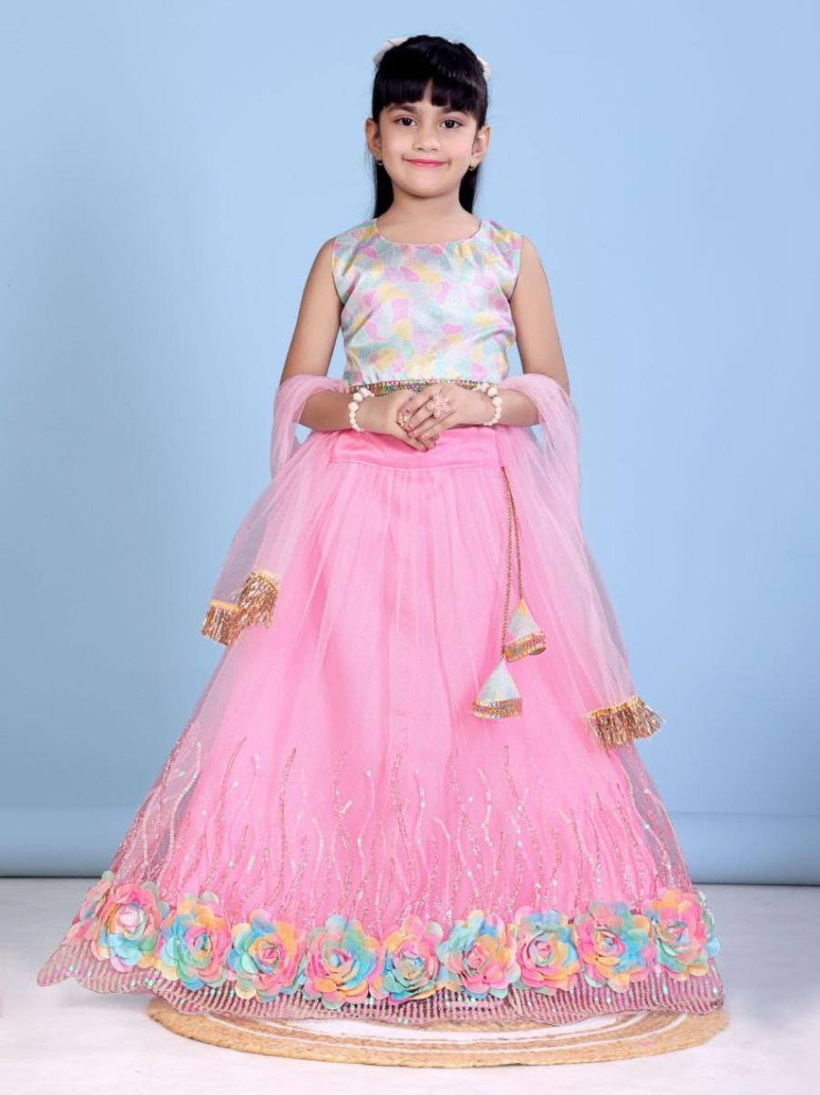 DESIGNER NET SEQUENCE WORK AND FLOWERS WORK KID’S LEHENGA CHOLI WITH DUPATTA BABY PINK