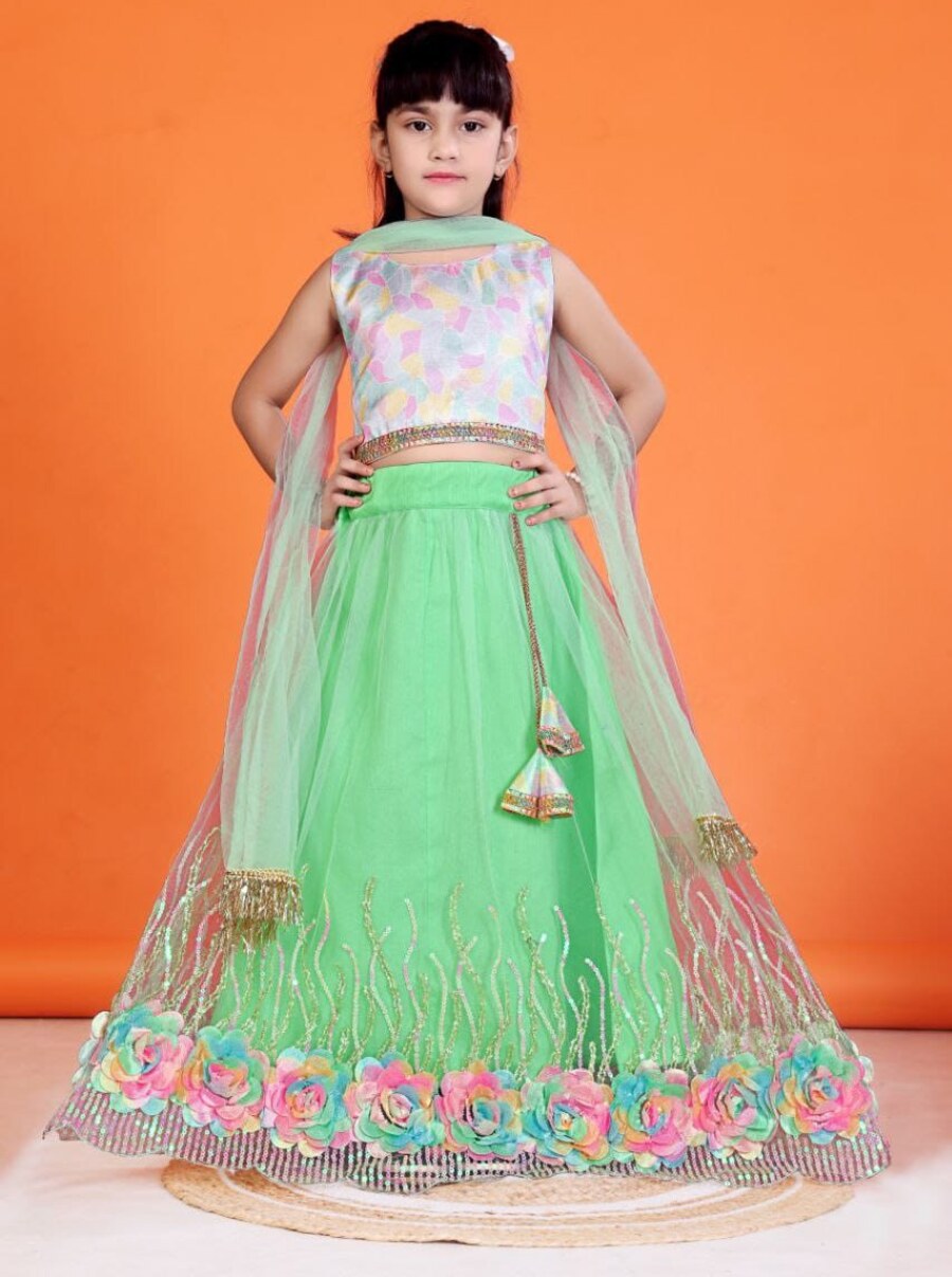 DESIGNER NET SEQUENCE WORK AND FLOWERS WORK KID’S LEHENGA CHOLI WITH DUPATTA GREEN