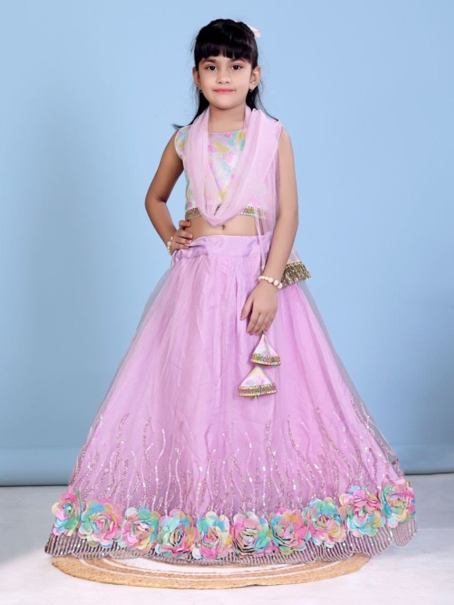 DESIGNER NET SEQUENCE WORK AND FLOWERS WORK KID’S LEHENGA CHOLI WITH DUPATTA LAVENDER