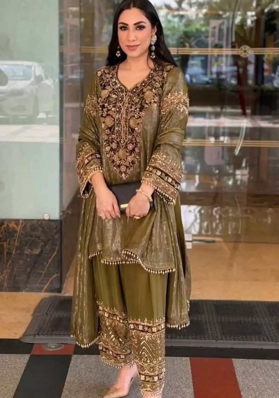 TOP FABRIC :HEAVY PURE VISCOSE VELVET WITH EMBROIDERY 5 MM SEQUENCE WORK WITH FANCY BELL SLEEVE & FANCY MOTI LATKAN