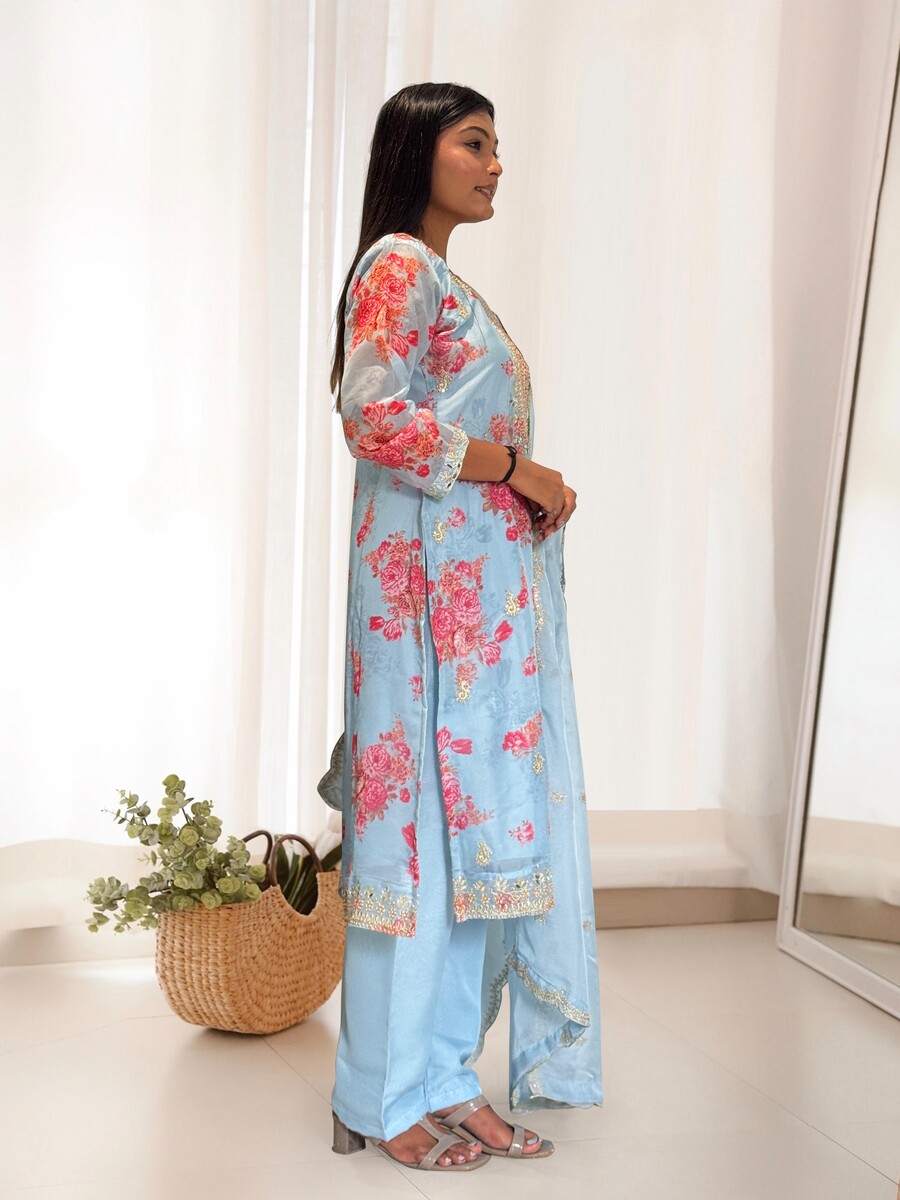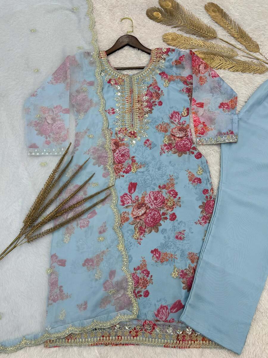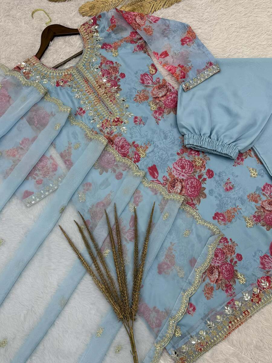 DESIGNER ORGANZA DIGITAL PRINTED EMBROIDERY CODING SEQUENCE WORK TOP BOTTOM WITH DUPATTA SKY