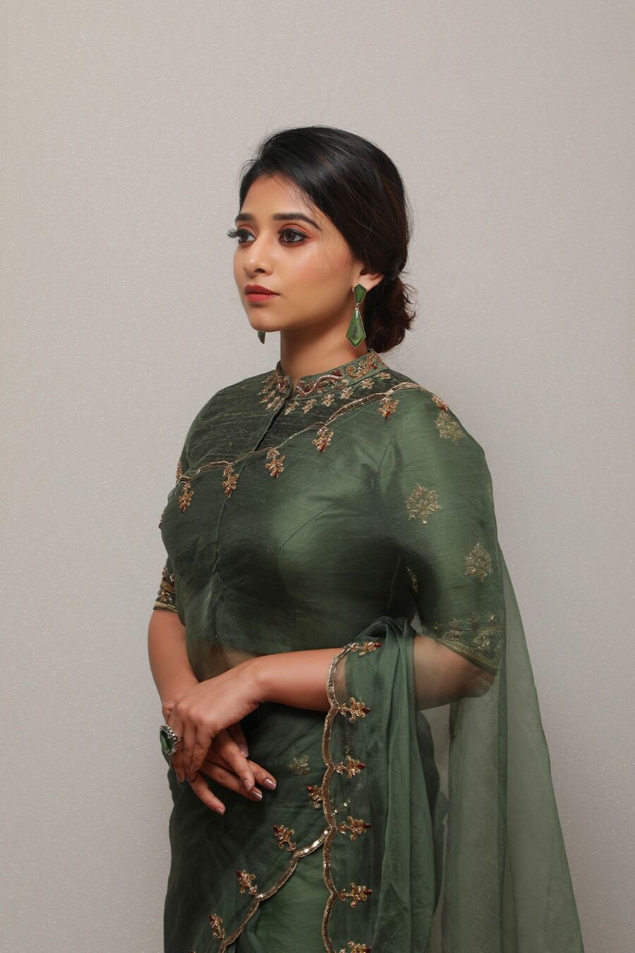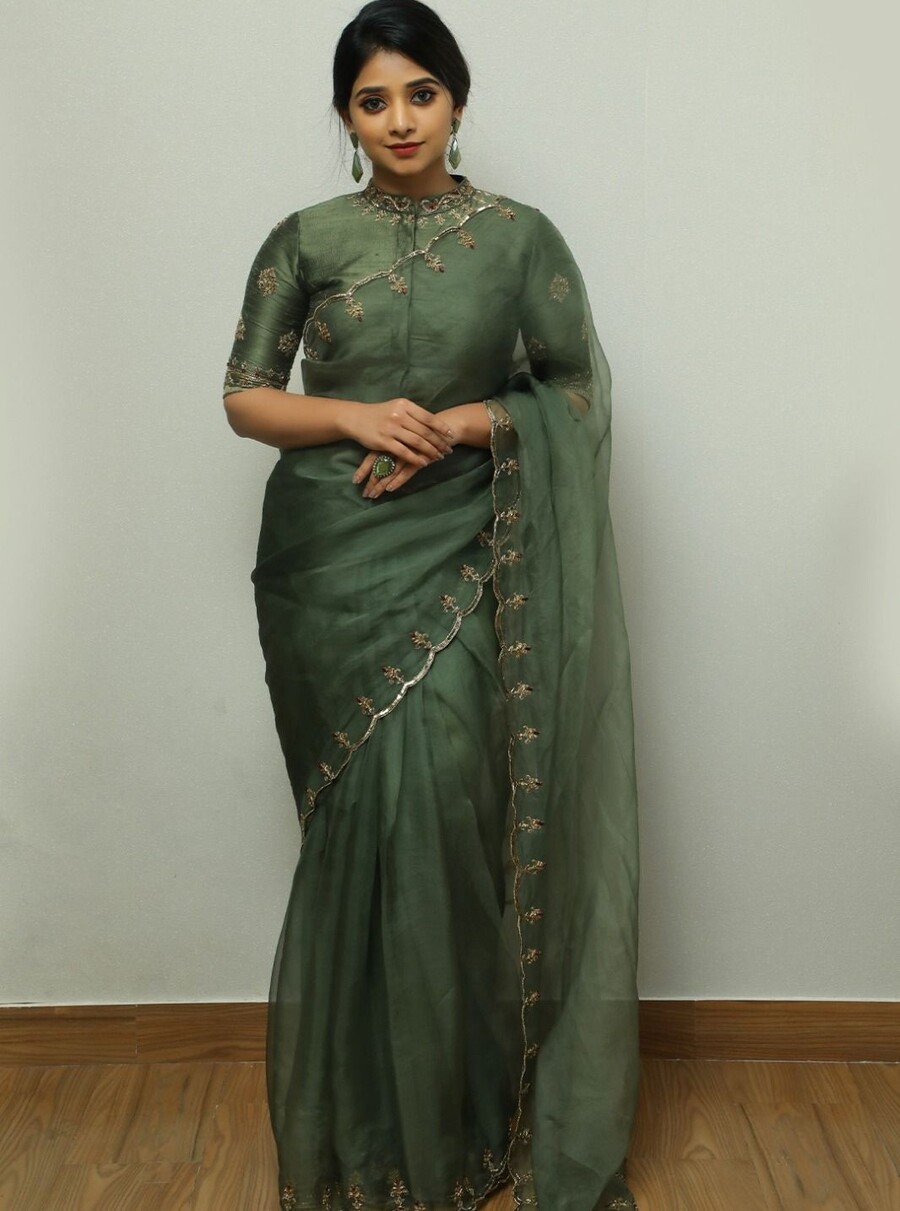 DESIGNER ORGANZA HANDWORK, CUTWORK WITH ZARDOSI AND SEQUENCE WORK SAREE WITH UNSTITCHED BLOUSE MEHNDI