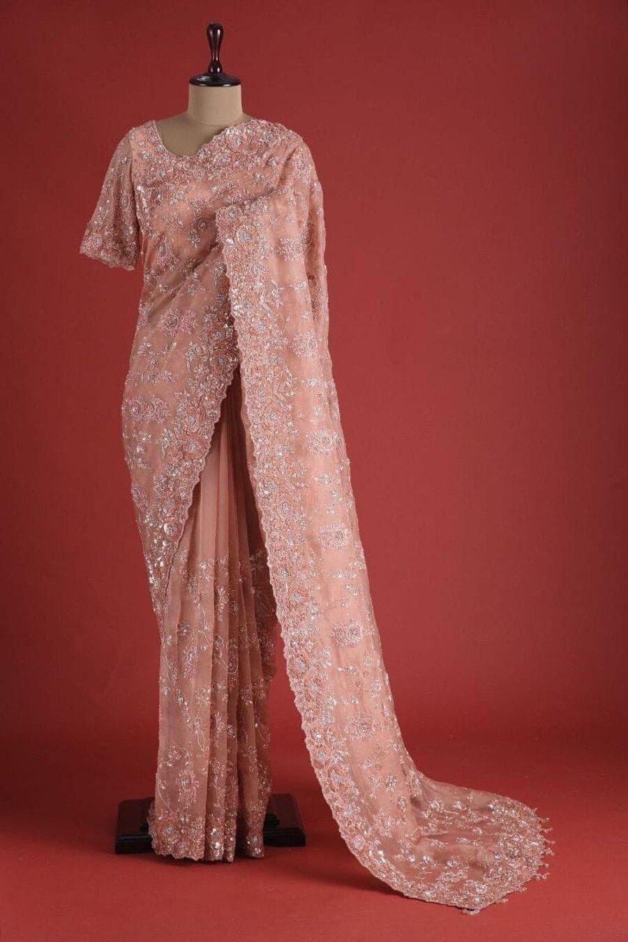 DESIGNER ORGANZA SILK EMBRODERY THREAD, ZARI WITH SEQUENCE WORK SAREE WITH UNSTITCHED BLOUSE BABY PINK
