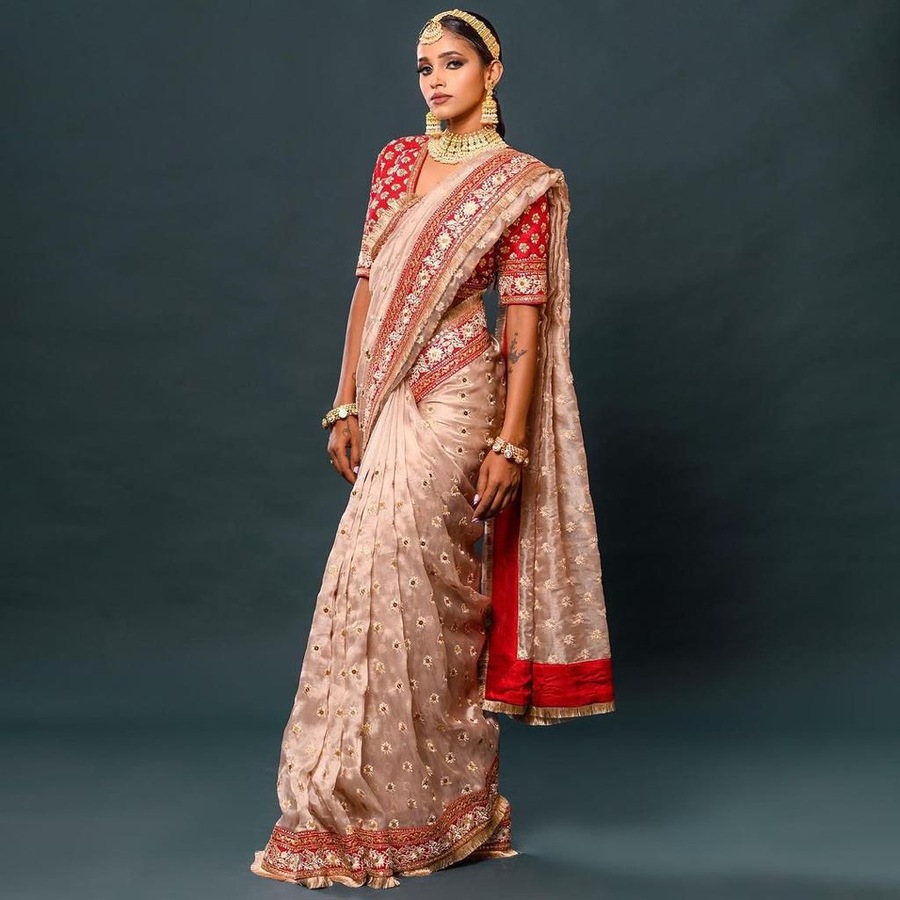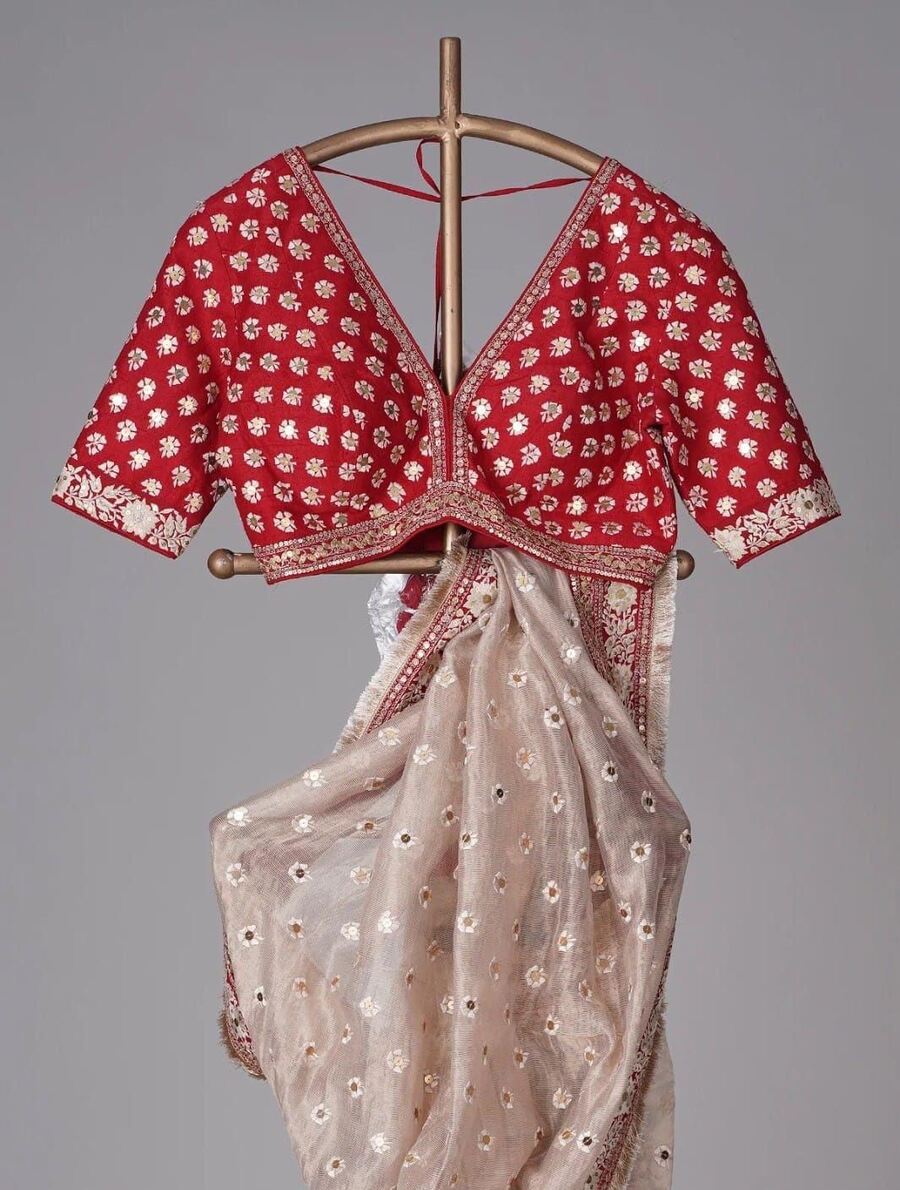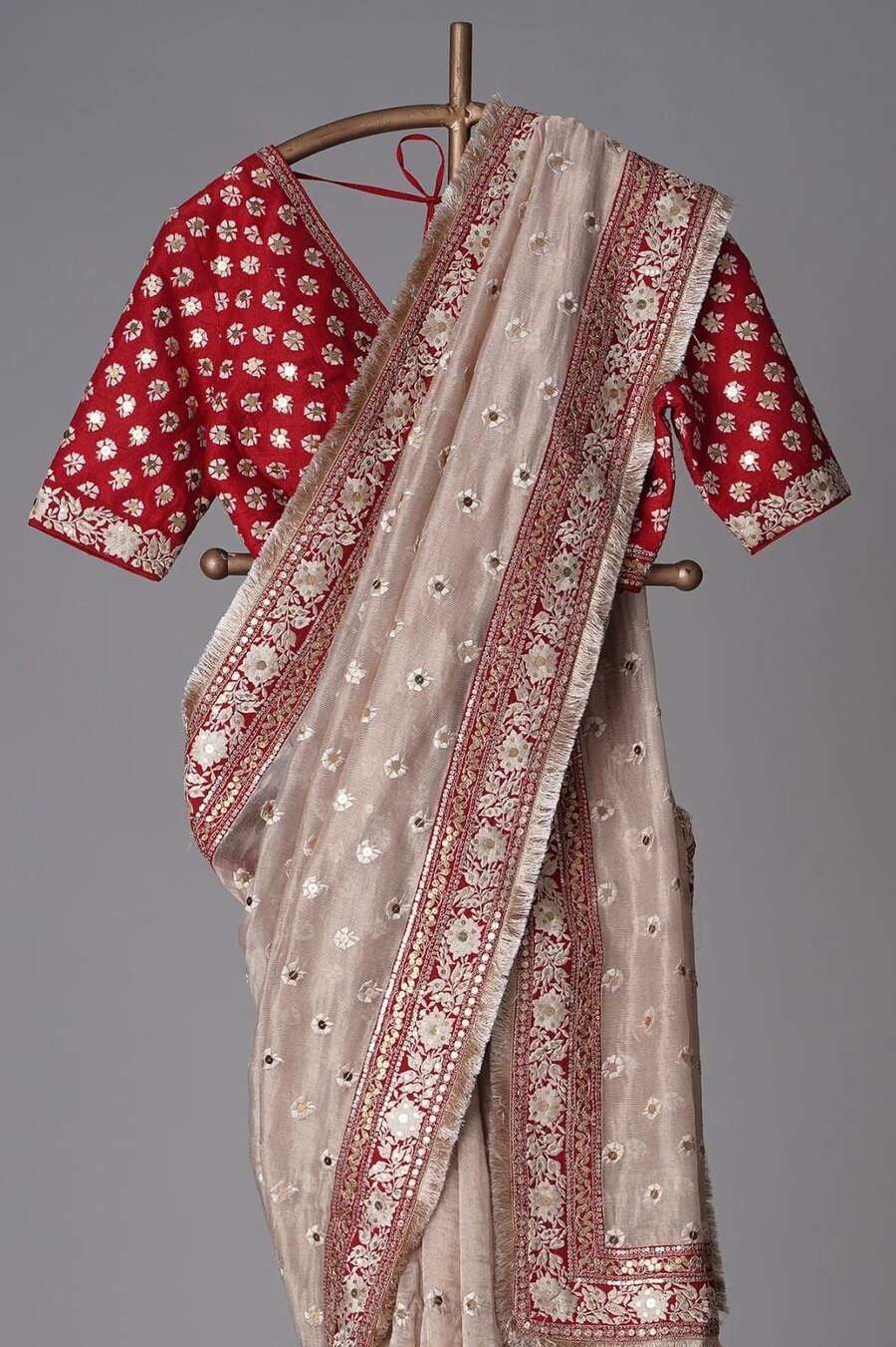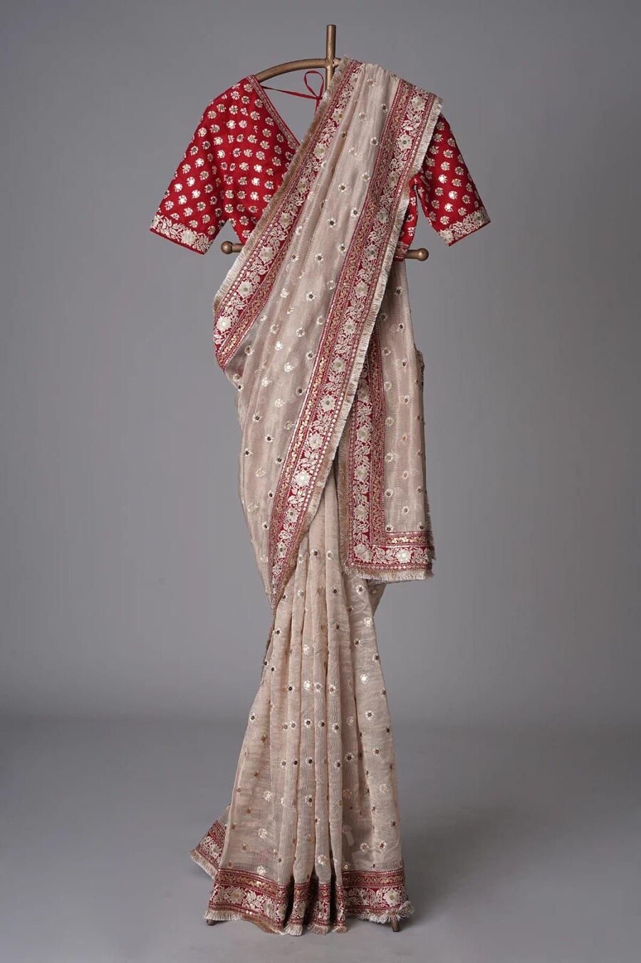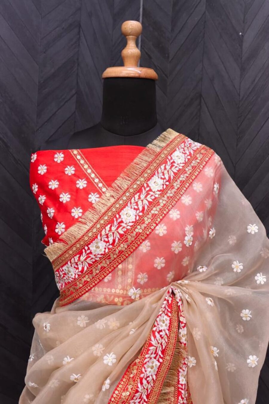 DESIGNER ORGANZA SILK EMBRODIERY VISCOSE THRED AND ZARI CODING WORK SAREE WITH UNSTITCHED BLOUSE CREAM AND RED