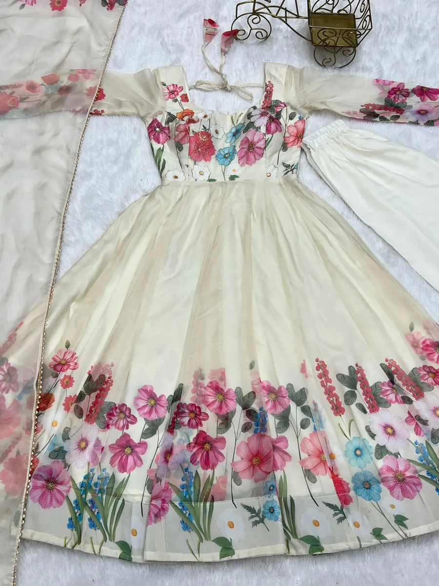 DESIGNER ORGANZA SILK PRINT WORK WITH ZARI FLOWER OUTING WORK GOWN PANT WITH DUPATTA OFF WHITE