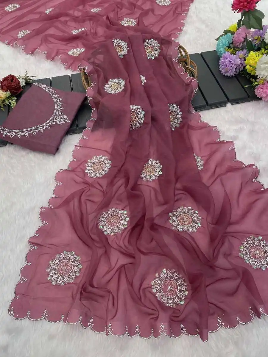 DESIGNER ORGNAZA HAND JARKHAN AND DIAMOND WORK SAREE WITH UNSTITCHED BLOUSE WINE