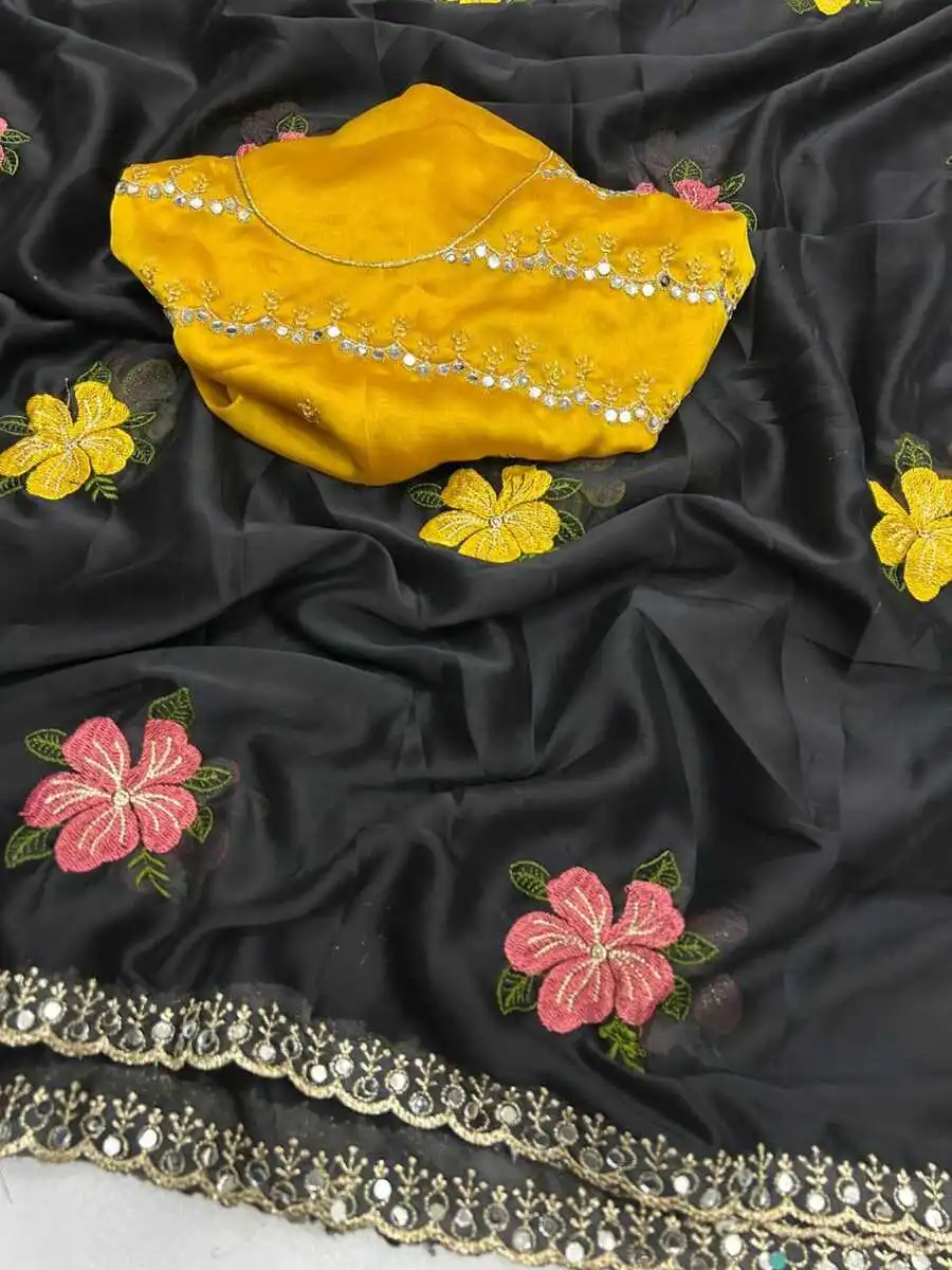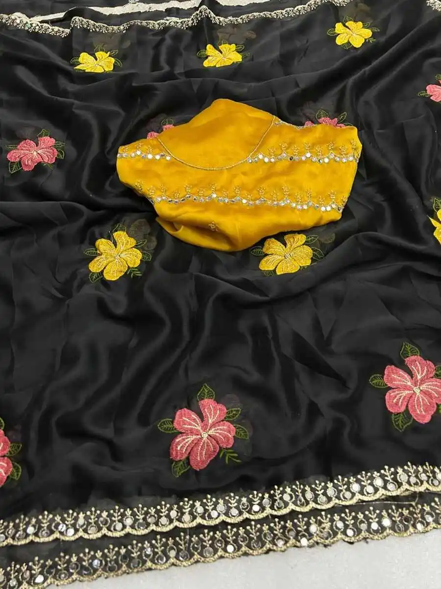DESIGNER RANGOLI FLORAL EMBROIDERY THREAD WITH REAL MIRROR WORK SCALLOPED AND BORDER WORK SAREE WITH UNSTITCHED BLOUSE BLACK