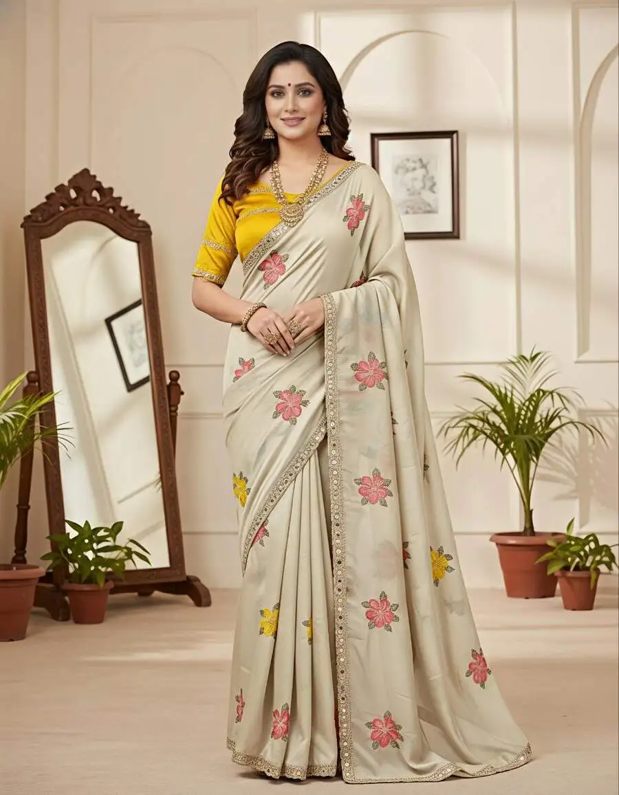 DESIGNER RANGOLI FLORAL EMBROIDERY THREAD WITH REAL MIRROR WORK SCALLOPED AND BORDER WORK SAREE WITH UNSTITCHED BLOUSE CREAM