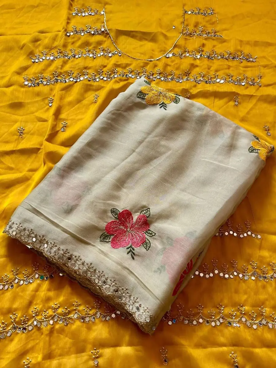DESIGNER RANGOLI SILK EMBROIDERY AND REAL MIRROR ALL OVER AND ZARI WORK SAREE WITH UNSTITCHED BLOUSE CREAM