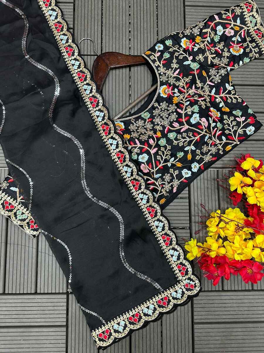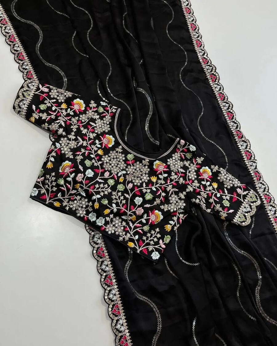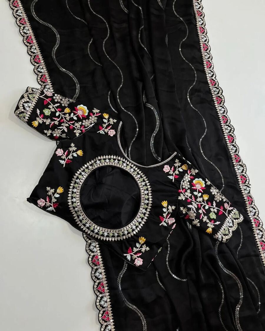 DESIGNER RANGOLI SILK EMBROIDERY SEQUENCE WITH MULTI THREAD WORK AND CUT WORK BORDER SAREE WITH STITCHED BLOUSE BLACK
