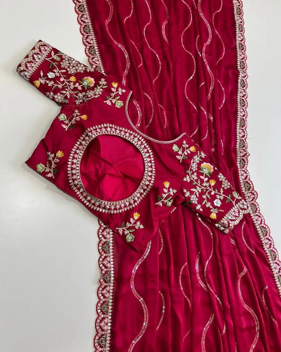 SAREE FABRIC : PREMIUM DIAMOND CHINON SILK WITH HEAVY EMBROIDERY CODING MULTI TREADS AND SEQUENCE WORK