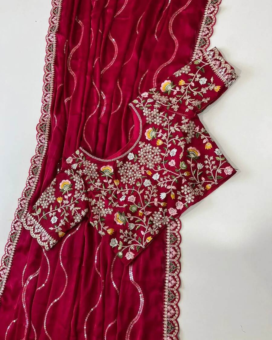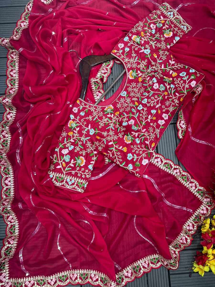 SAREE FABRIC :- PREMIUM GEORGETTE WITH ALL OVER SEQUENCE AND THREAD WORK AND BORDER IN EMBROIDERY CODING AND SEQUENCE WORK WITH FANCY CUT WORK