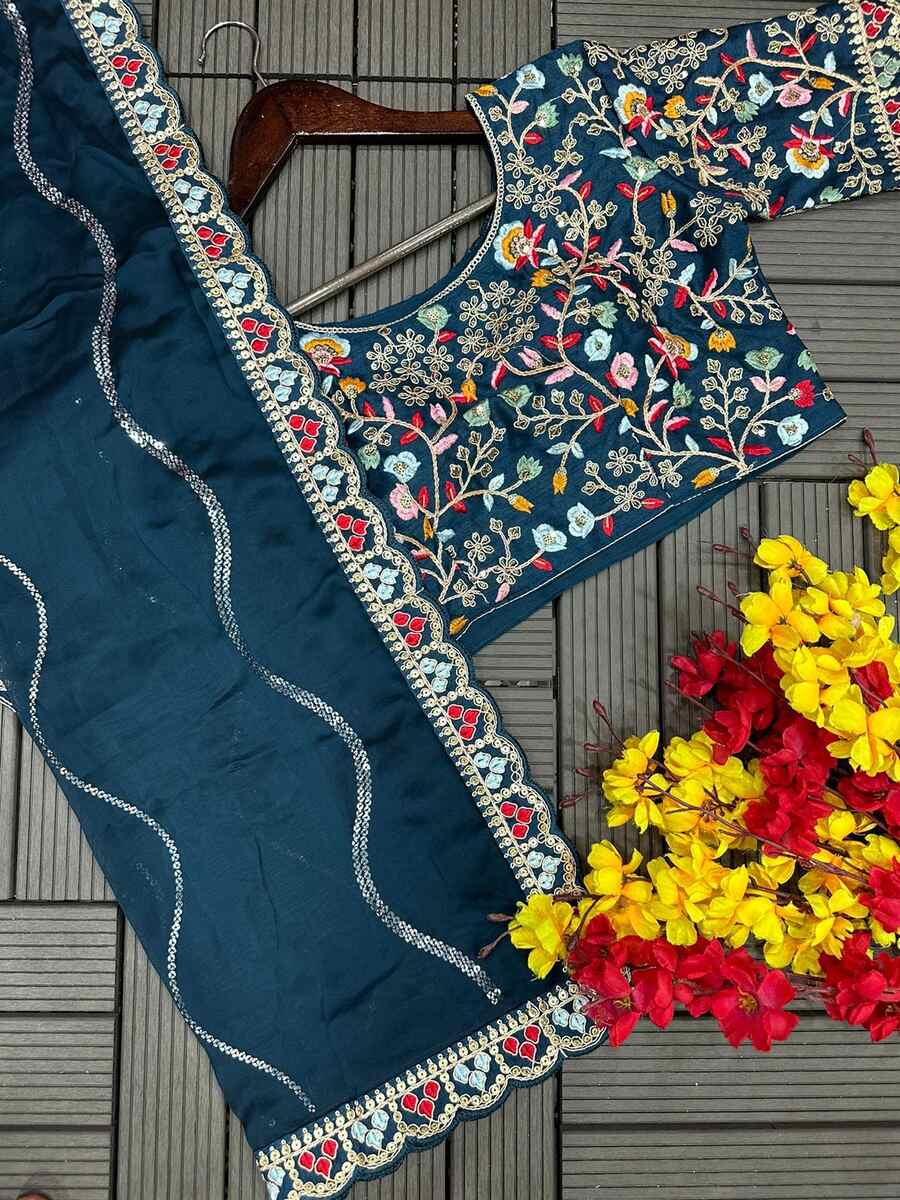 DESIGNER RANGOLI SILK EMBROIDERY SEQUENCE WITH MULTI THREAD WORK AND CUT WORK BORDER SAREE WITH STITCHED BLOUSE TEAL