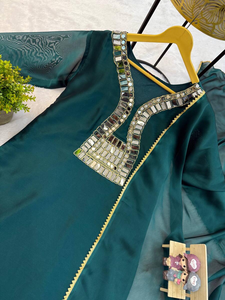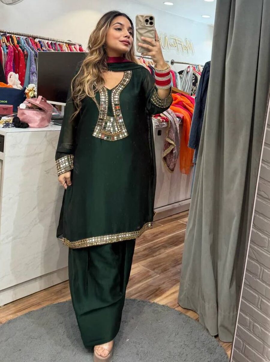 DESIGNER RANGOLI SILK EMBROIDERY WITH REAL MIRROR WORK TOP PATIYALA WITH DUPATTA GREEN